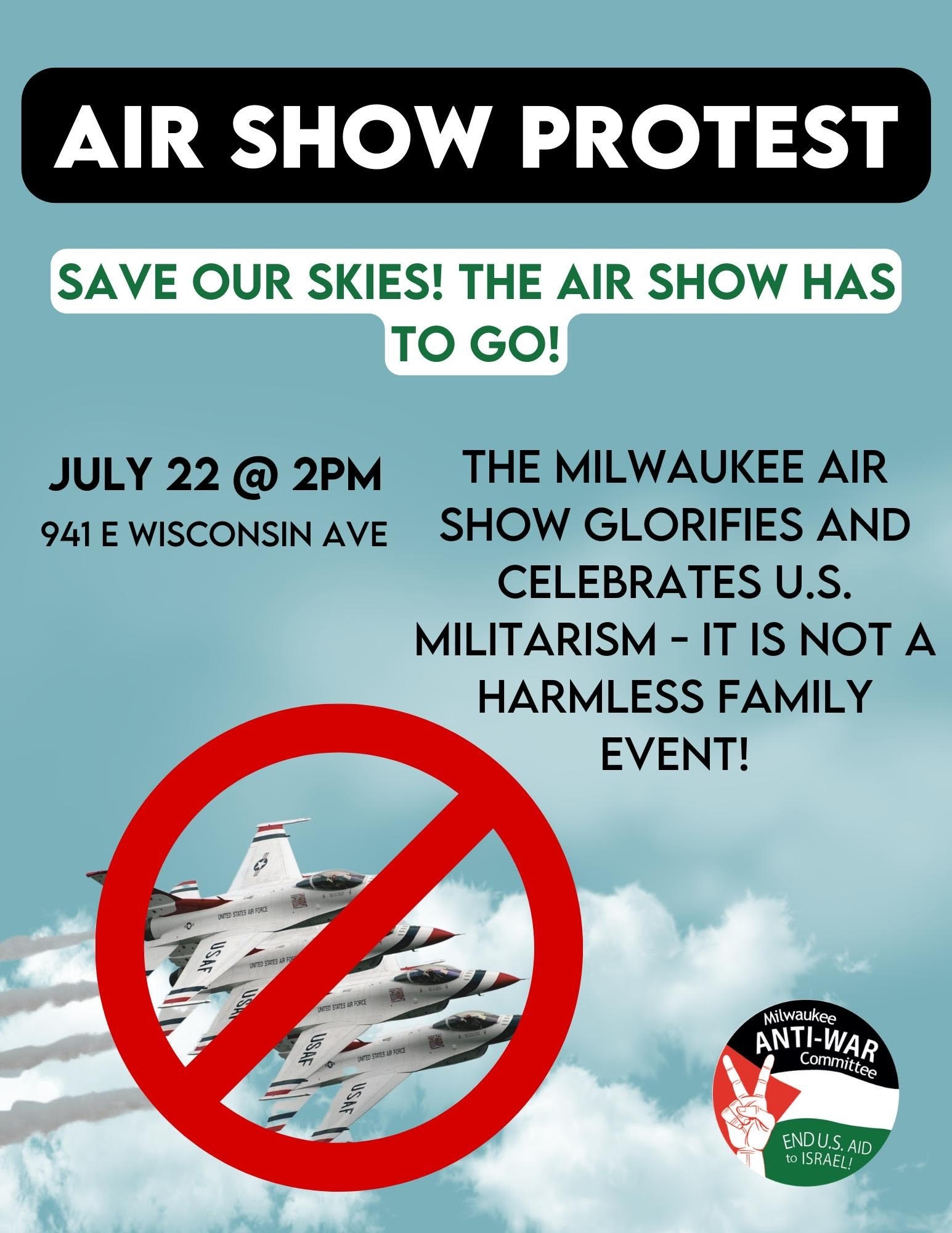 Categories Uncategorized Milwaukee, July 22, 2023: Air Show Protests! Money for Workers and Communities NOT the Endless U.S. War Machine! Post author By wibailoutpeople Post date July 14, 2023 Share this: Click to share on X (Opens in new window) X Click to share on Facebook (Opens in new window) Facebook Like Loading... Related ← Haiti and Bastille Day → Madison, July 22, 2023: People’s Justice Summit!
