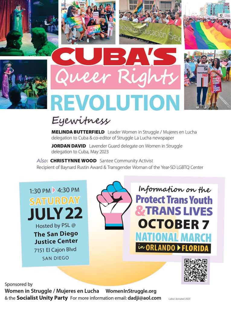 | Saturday, JULY 22, 2023, AT 2:30 PM PDT Cuba’s Queer Rights Revolution – Eyewitness San Diego Justice Center, 7151 El Cajon Blvd, San Diego Celebrate Queer Pride – Learn about the revolutionary Families Code in […] |
