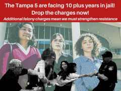 On August 9, the Emergency Committee to Defend the Tampa 5 is calling on all member groups to declare a National Day of Protest! On July 12, we saw at least 15 cities pour out into the streets to say, “Drop the charges!”