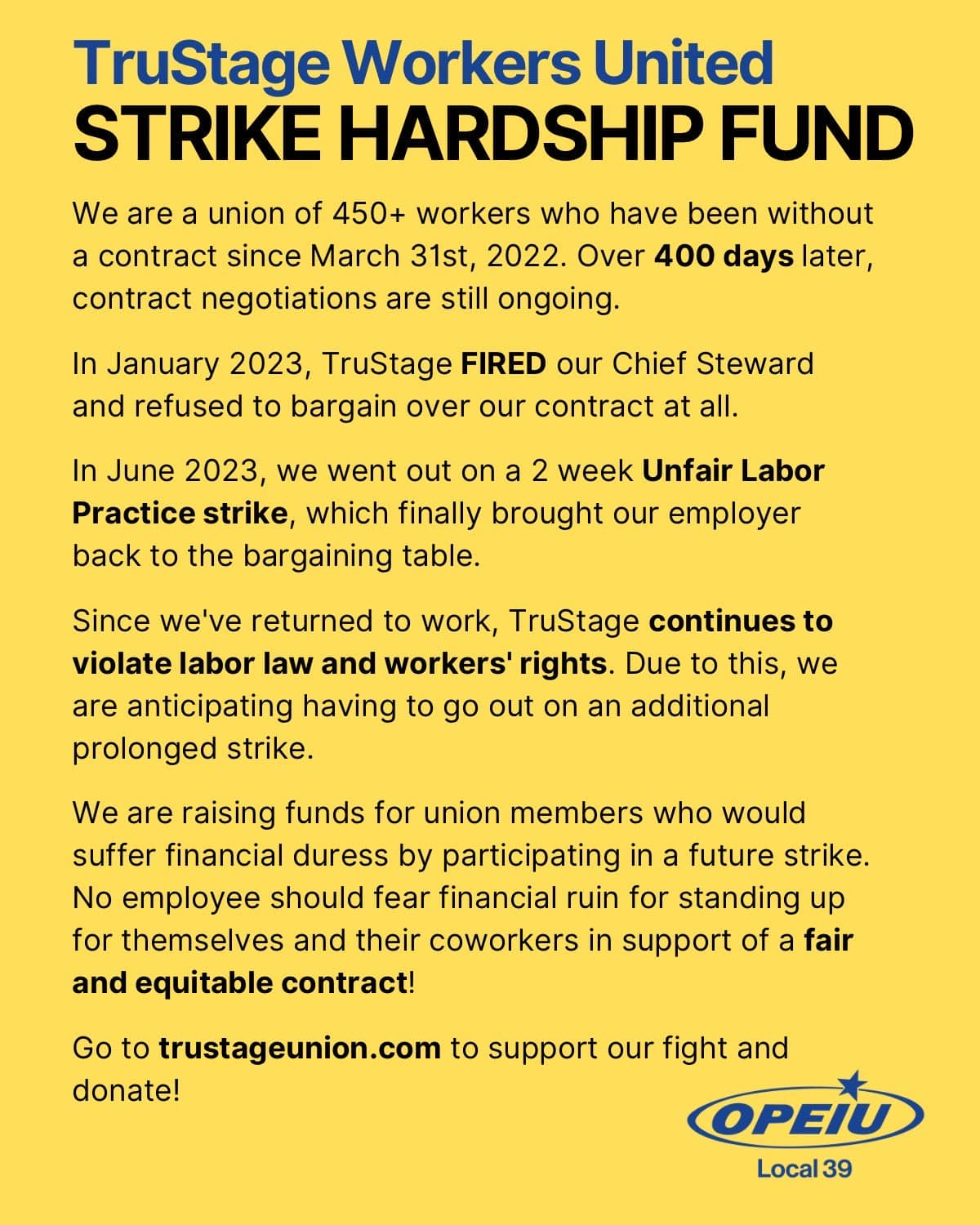 We are raising funds for union members who would financial financial duress by participating in a future strike. No employee should fear financial ruin for standing up for themselves and their coworkers in support of a fair and equitable contract!