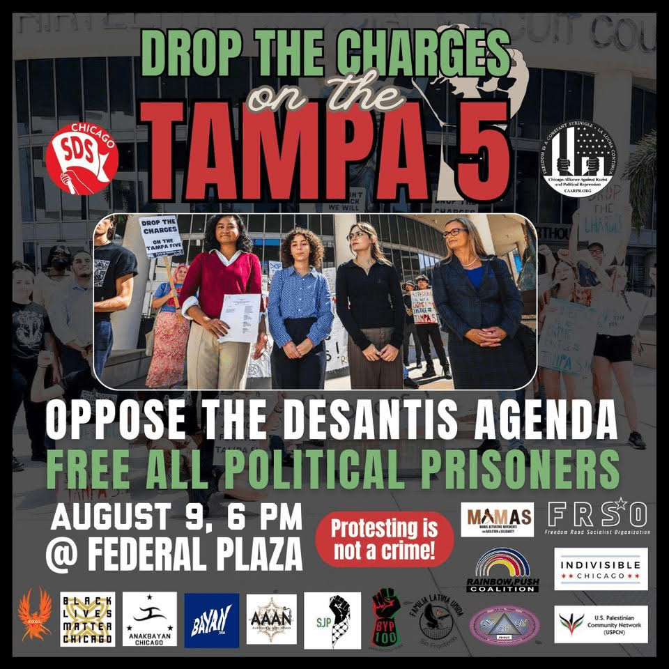Categories Uncategorized Chicago, August 9, 2023: Drop the Charges Against the Tampa 5! Post author By wibailoutpeople Post date August 8, 2023 Share this: Share on X (Opens in new window) X Share on Facebook (Opens in new window) Facebook Like Loading... Related ← Burkina Faso’s President Traoré Delivers Anti-Imperialist Speech at Russia–Africa Summit → Milwaukee, August 9, 2023: Solidarity With the Tampa 5! – Drop All the Bogus Charges NOW!