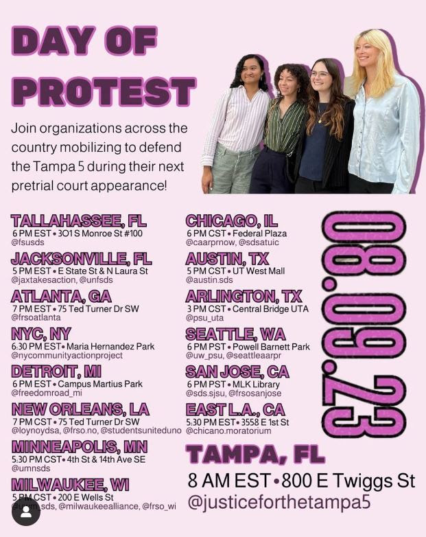 | View this email in your browser committeetodefendthetampa5@gmail.com They are still in the middle of the process of discovery, which means that they are collecting evidence from the prosecution that is meant to convict them. They have said publicly that all the security camera footage they have seen so far absolves them, and they are eager to not only receive more of this evidence but also to share it with the world. The Tampa 5 and their supporters demand full transparency and USF’s full cooperation with discovery, to which all of the defendants are entitled. In spite of this, the charges have not yet been dropped. The case of the 5 SDS protesters is hurtling towards a trial. So they need all of their supporters and all parties interested in the right to protest DeSantis to stay out in the streets! On July 12th, we saw at least 15 cities pour out into the streets to say, “Drop the Charges!” We need to be out again on August 9th in even greater numbers. We need to demand that the DeSantis-appointed, unelected State Attorney Susan Lopez and assistant prosecutor Justin Diaz drop the charges. We need to win this case once and for all and protect the right of the student movement – and all social movements in the United States – to exercise their First Amendment right to free speech and to protest. |