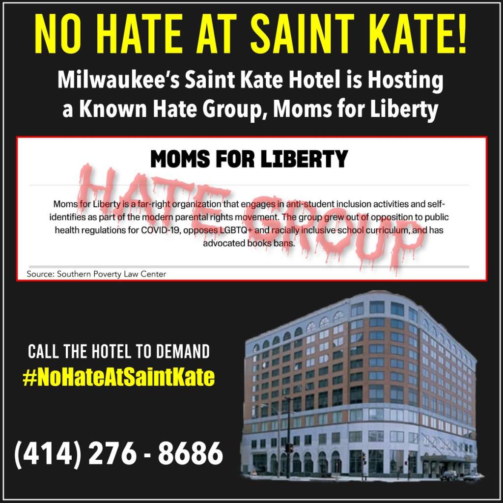 Milwaukee’s Saint Kate Hotel is hosting a school board training by Moms for Liberty, a group that opposes LGBTQ+ rights, racially inclusive school curriculum, quotes Hitler and has advocated for book bans. This is exactly why the Southern Poverty Law Center has labeled the group an extremist hate group.