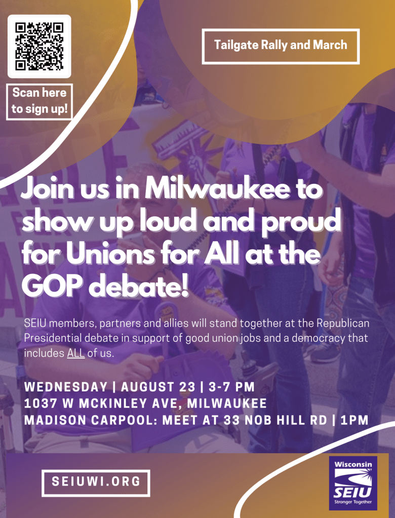 Categories Uncategorized Unions to Rally and March in Milwaukee, Wisconsin to Protest the RNC Presidential Debate August 23, 2023 Post author By wibailoutpeople Post date August 13, 2023 SEIU Wisconsin Share this: Click to share on X (Opens in new window) X Click to share on Facebook (Opens in new window) Facebook Like Loading... Related ← Support Starbucks Workers at the Bargaining Table! Union, YES! → Milwaukee, August 22, 2023: No to Anti-Trans Hate Groups: Protect LGBTQ Youth! – Stop the Moms For Bigotry and other Hate Groups!