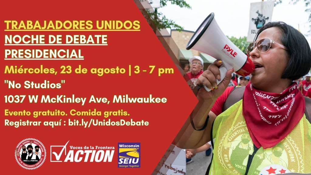 Qué: El miércoles 23 de agosto es el primer Debate Presidencial Republicano (8pm-10pm en Fiserv Forum) y los trabajadores y aliados de Milwaukee están unidos para enviar un fuerte mensaje de que los derechos de los TRABAJADORES son una prioridad y no esperarán menos.