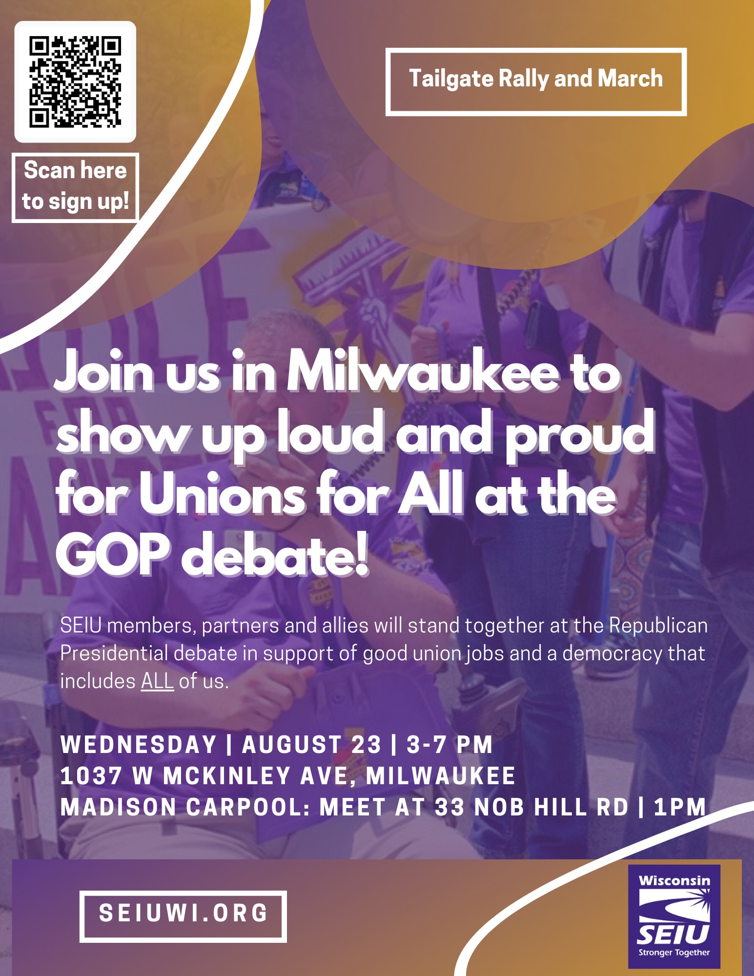 Categories Uncategorized SEIU Wisconsin, Voces de la Frontera and Other Labor-Community Organizations to Protest RNC Debate August 23, 2023 Post author By wibailoutpeople Post date August 23, 2023 Join SEIU members, partners and allies at our tailgate rally and march at the RNC Debate. We are fighting for #UnionsForAll and to make our communities heard.Fill out the link below or scan the QR code!https://mobilize.us/s/IJ4EZJ SEIU Wisconsin Share this: Share on X (Opens in new window) X Share on Facebook (Opens in new window) Facebook Like Loading... Related ← Protestors Denounce Anti-Trans Bigots “Training” at Pfister Hotel in Milwaukee, WI → People’s Coalition Rally and March at the Republican “Presidential Debate” August 23, 2023 in Milwaukee, Wisconsin!