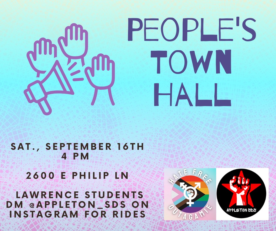 Categories Uncategorized Appleton, WI, September 16, 2023: People’s Town Hall Post author By wibailoutpeople Post date September 10, 2023 Join us to share what matters to you about feeling safe and welcome in your community, connect with your neighbors, and build people power here in Outagamie County.Lawrence students can DM @appleton_sds on instagram for rides! Share this: Click to share on X (Opens in new window) X Click to share on Facebook (Opens in new window) Facebook Like Loading... Related ← The upcoming summit of the G77 group plus China in Havana: A draft declaration goes around the world → Neenah, Wisconsin: Worker & Community Summit! – Union, YES!