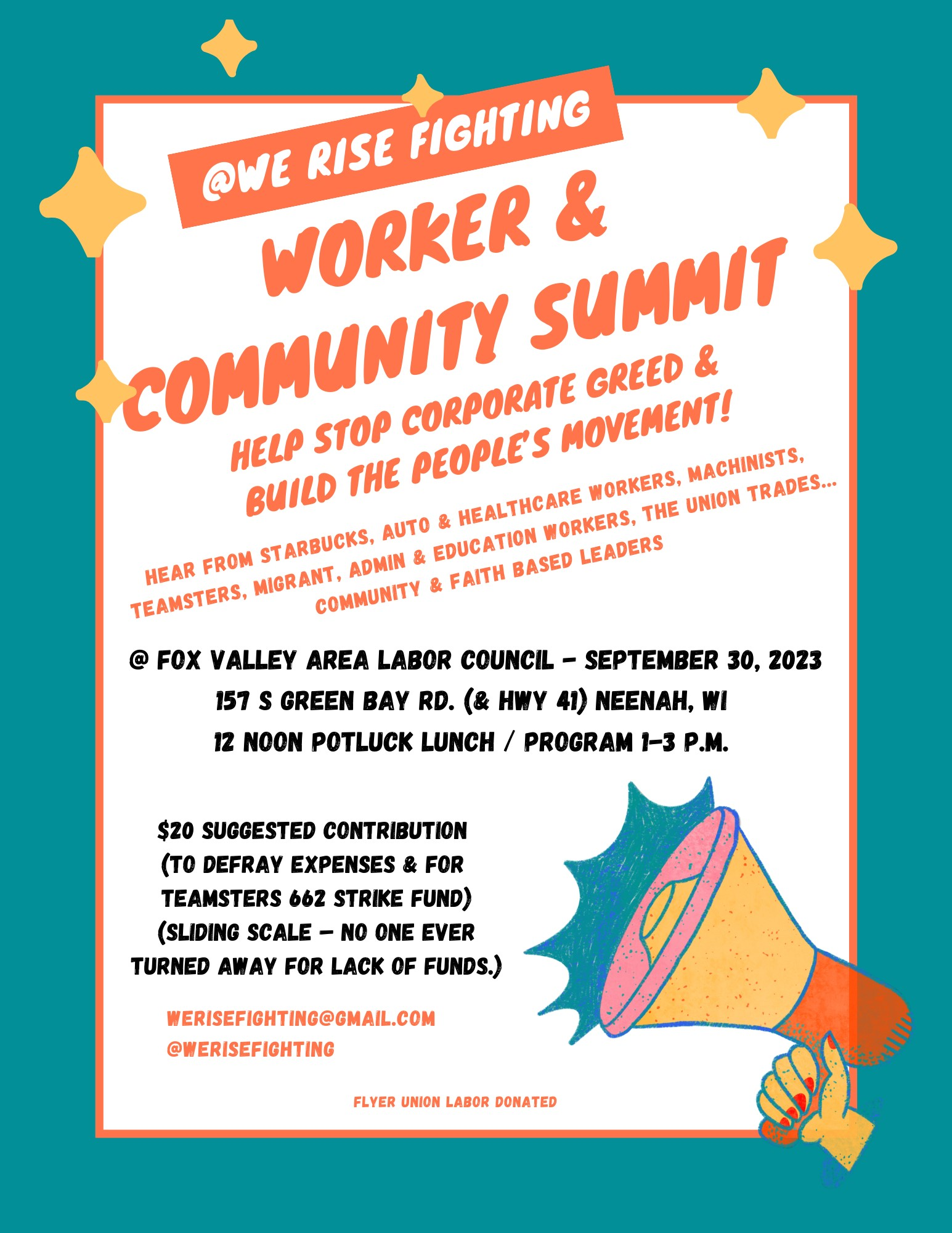 Categories Uncategorized Worker & Community Summit in Neenah, WI September 30, 2023 – Help Stop Corporate Greed and Build the People’s Movement! Post author By wibailoutpeople Post date September 10, 2023 We Rise Fighting – Labor Podcast Share this: Share on X (Opens in new window) X Share on Facebook (Opens in new window) Facebook Like Loading... Related ← El Salvador: The Santa Marta and ADES Water Defenders under house arrest as the fight to have their charges dismissed continues → Stop Cop City: Free the activists!