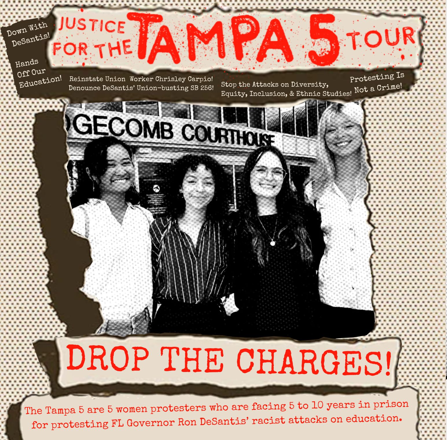 On March 6, 2023, members of Tampa Bay Students for a Democratic Society held a rally on the University of South Florida campus to defend diversity in higher education. At the rally, four women activists were suddenly and violently assaulted by USF police before being arrested. On April 4, another student received a communication of the university’s intent to charge her with additional misdemeanors and a felony – just like the other 4 activists.The Tampa 5 – Chrisley Carpio, Gia Davila, Lauren Pineiro, Laura Rodriguez, and Jeanie Kida – deserve our support. All they are guilty of is standing up to the DeSantis agenda! Come here about their case, about the struggle against repression in Florida, and stand in solidarity with these brave young women on the front lines of resistance to Gov. Ron DeSantis.