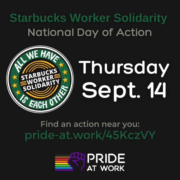 On 9/14 Starbucks customers & allies are organizing visibility & petitioning events across the country to demand Starbucks quit union busting! We are proud to join the national day of action in support of Starbucks workers! Find or host an action at: http://pride-at.work/45KczVY