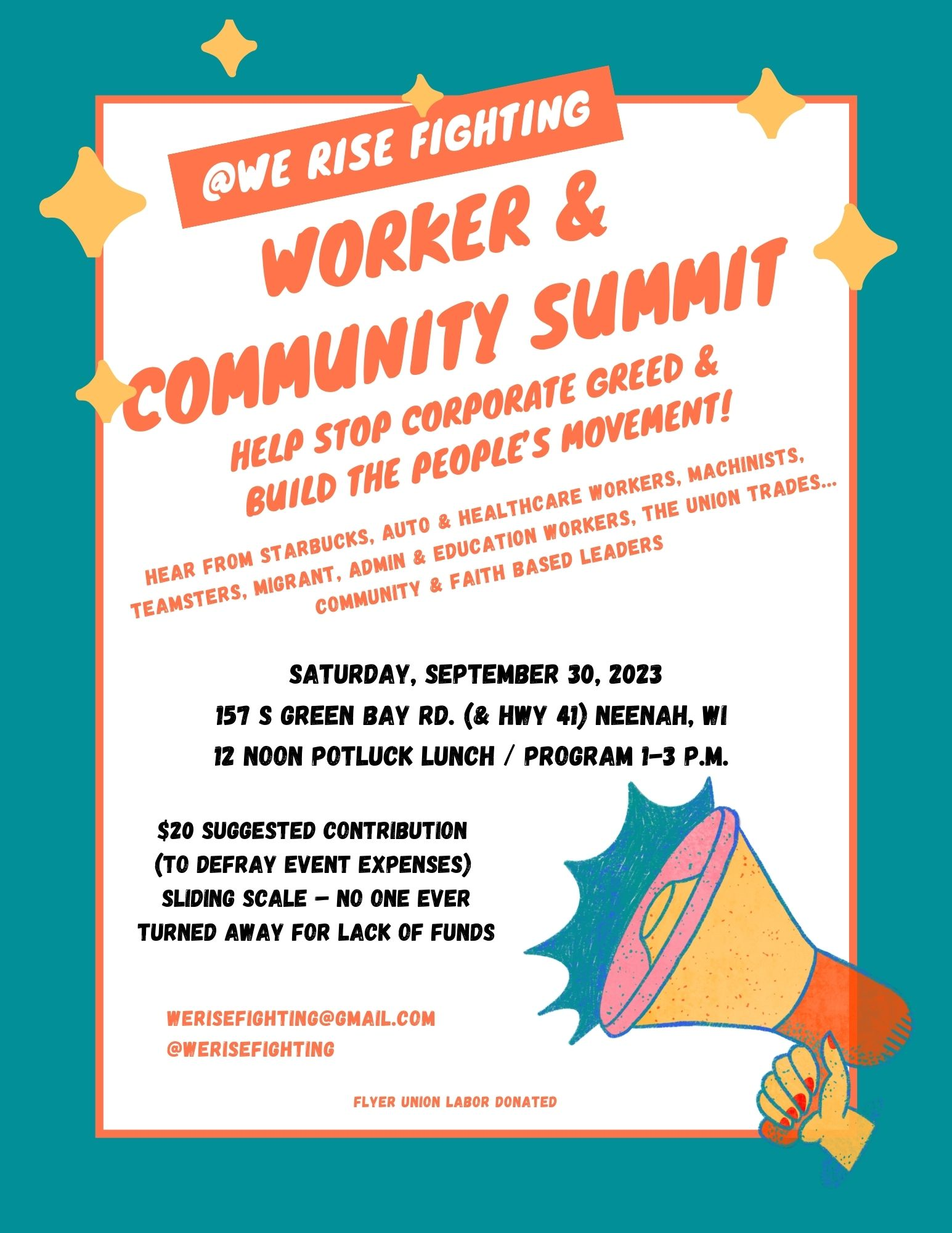 NEENAH, WI – A Worker and Community Summit will take place at the Neenah Labor Temple, 157 S Green Bay Rd., in Neenah, Wisconsin Saturday, September 30. A speaker’s panel from 1-3 p.m. will follow a noon potluck.