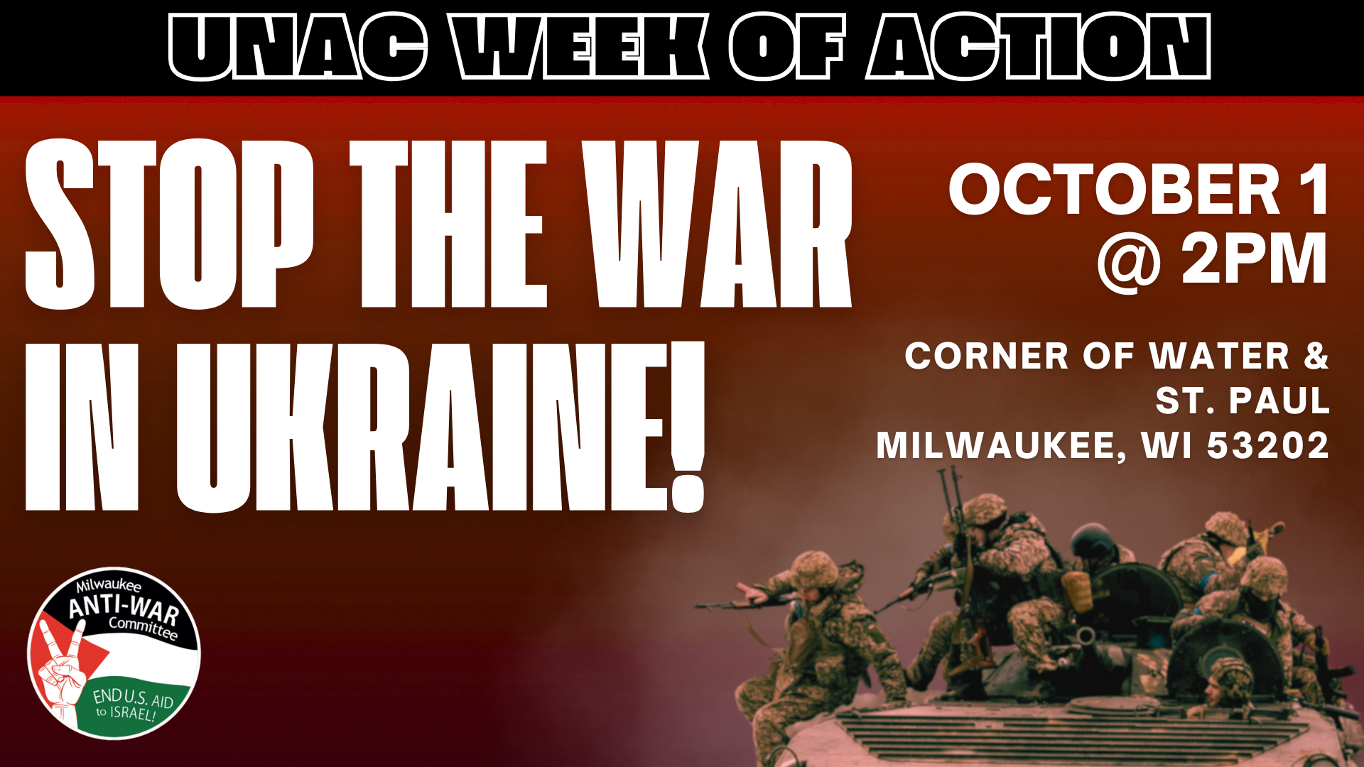 Categories Uncategorized Stop the U.S./NATO Led War in Ukraine! Money for People’s Needs Not Endless U.S. Wars! October 1, 2023 in Milwaukee Post author By wibailoutpeople Post date September 26, 2023 Share this: Click to share on X (Opens in new window) X Click to share on Facebook (Opens in new window) Facebook Like Loading... Related ← Black Alliance for Peace: From Niger to Haiti to Cop City, Defeat the War Against African People – Online October 1, 2023 → September 28, 2023 Webinar: Biden, Remove Cuba from the “State Sponsors of Terrorism” List! and End the U.S. Blockade!