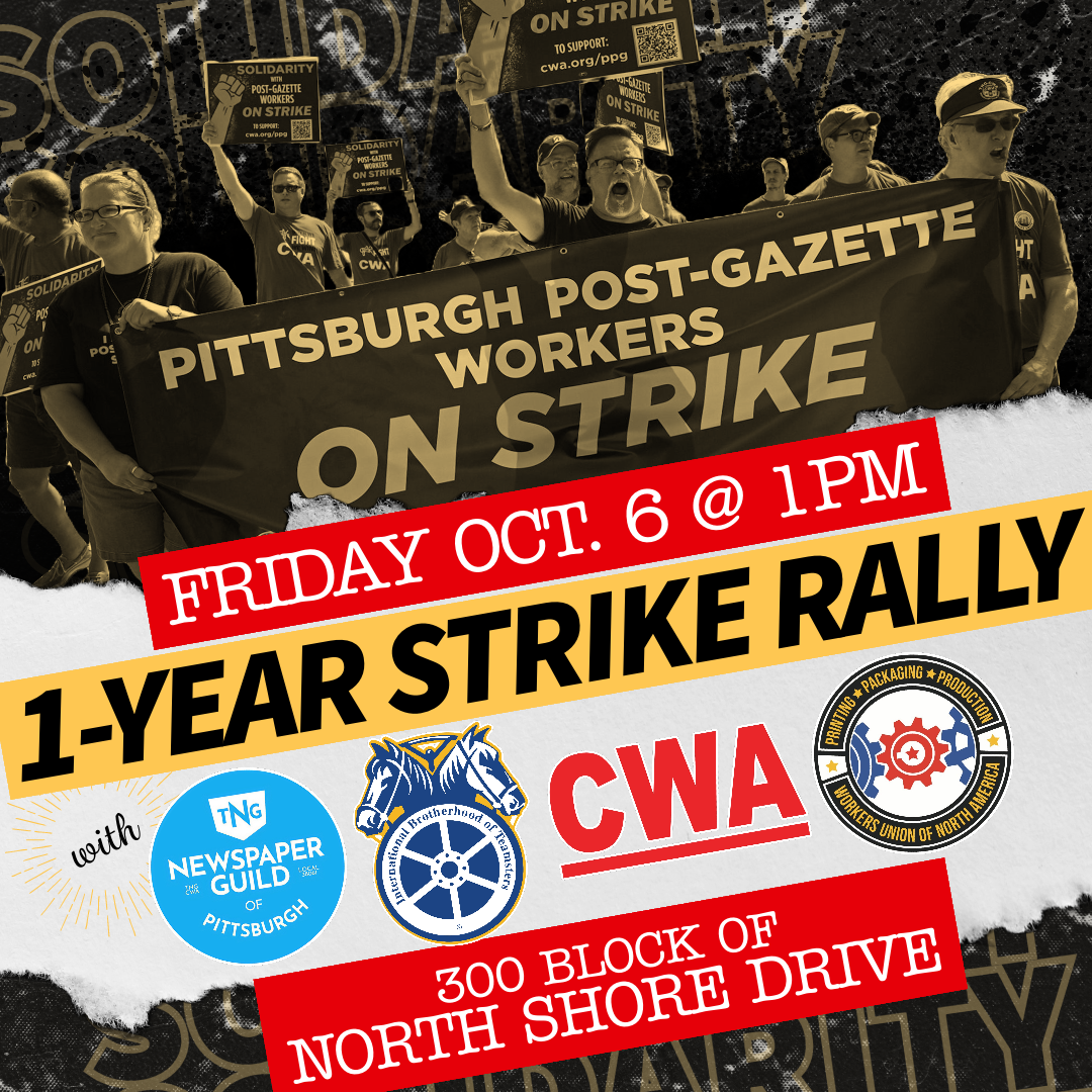 On Friday, Oct. 6, 2023 at 1 p.m., we’re rallying on North Shore Drive — outside the offices of the Post-Gazette — to mark one year on strike.