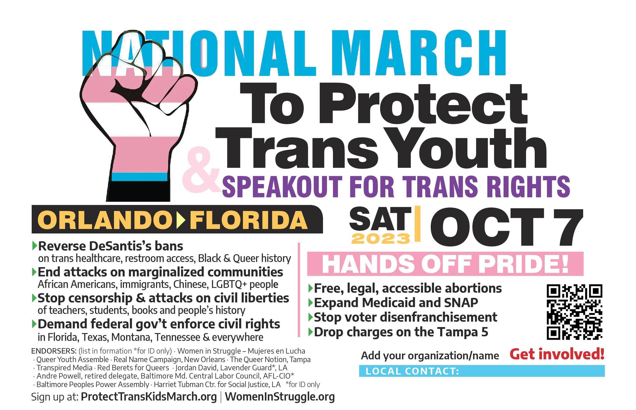 Categories Uncategorized Orlando, FL, October 7, 2023: National March to Protect Trans Youth – Speakout for Trans Rights! Post author By wibailoutpeople Post date October 6, 2023 https://protecttranskidsmarch.org/ Share this: Share on X (Opens in new window) X Share on Facebook (Opens in new window) Facebook Like Loading... Related ← Socialist Cuba Always Remembers the Irish Hunger Strikers! → Sign the Petition to Save Will Speer from Execution!
