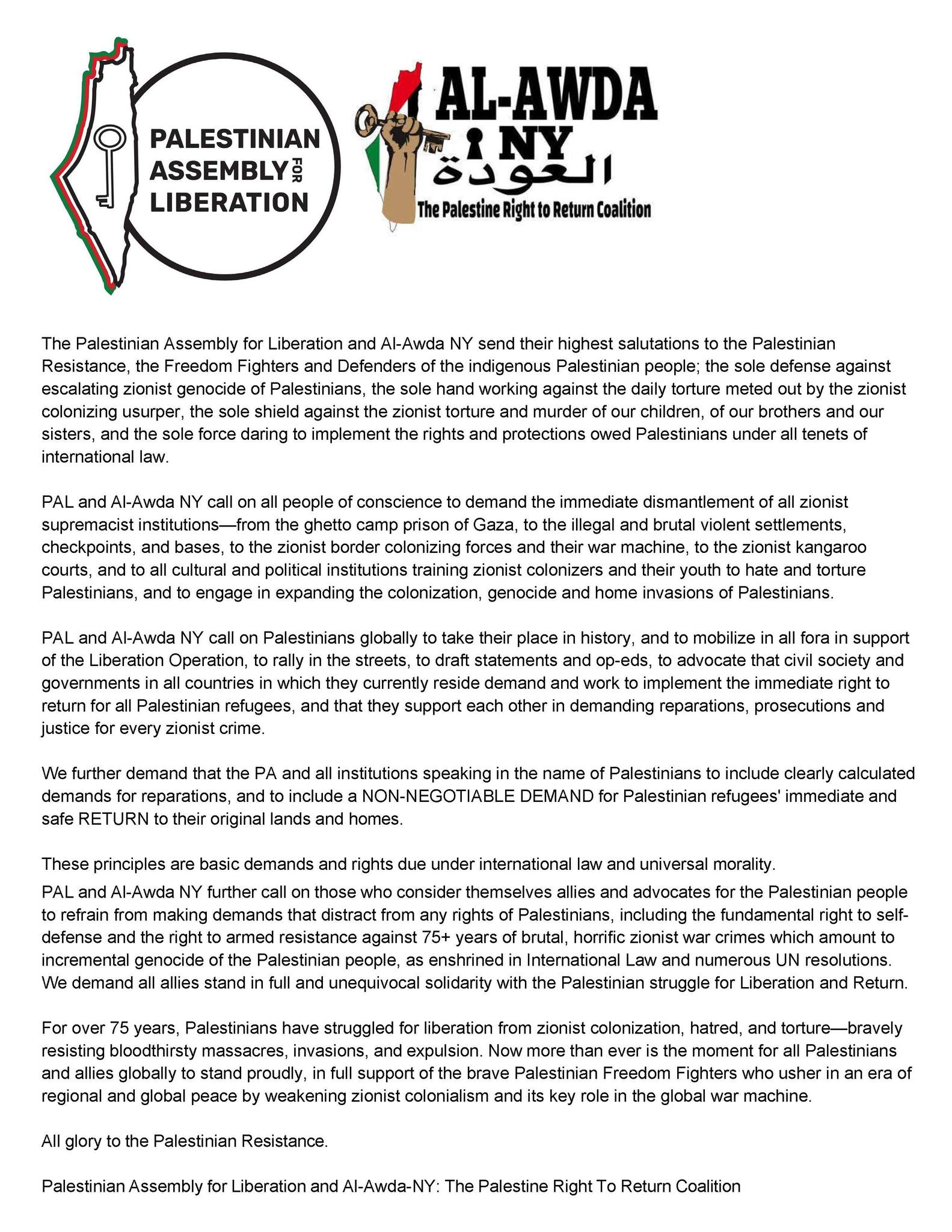 Categories Uncategorized Al-Awda NY: The Palestine Right to Return Coalition Statement Post author By wibailoutpeople Post date October 7, 2023 October 7, 2023 Al-Awda NY: The Palestine Right to Return Coalition Share this: Share on X (Opens in new window) X Share on Facebook (Opens in new window) Facebook Like Loading... Related ← Emergency Protests Across the U.S. for Palestine! → Cuba commemorates 50th anniversary of Fidel Castro’s visit to Vietnam