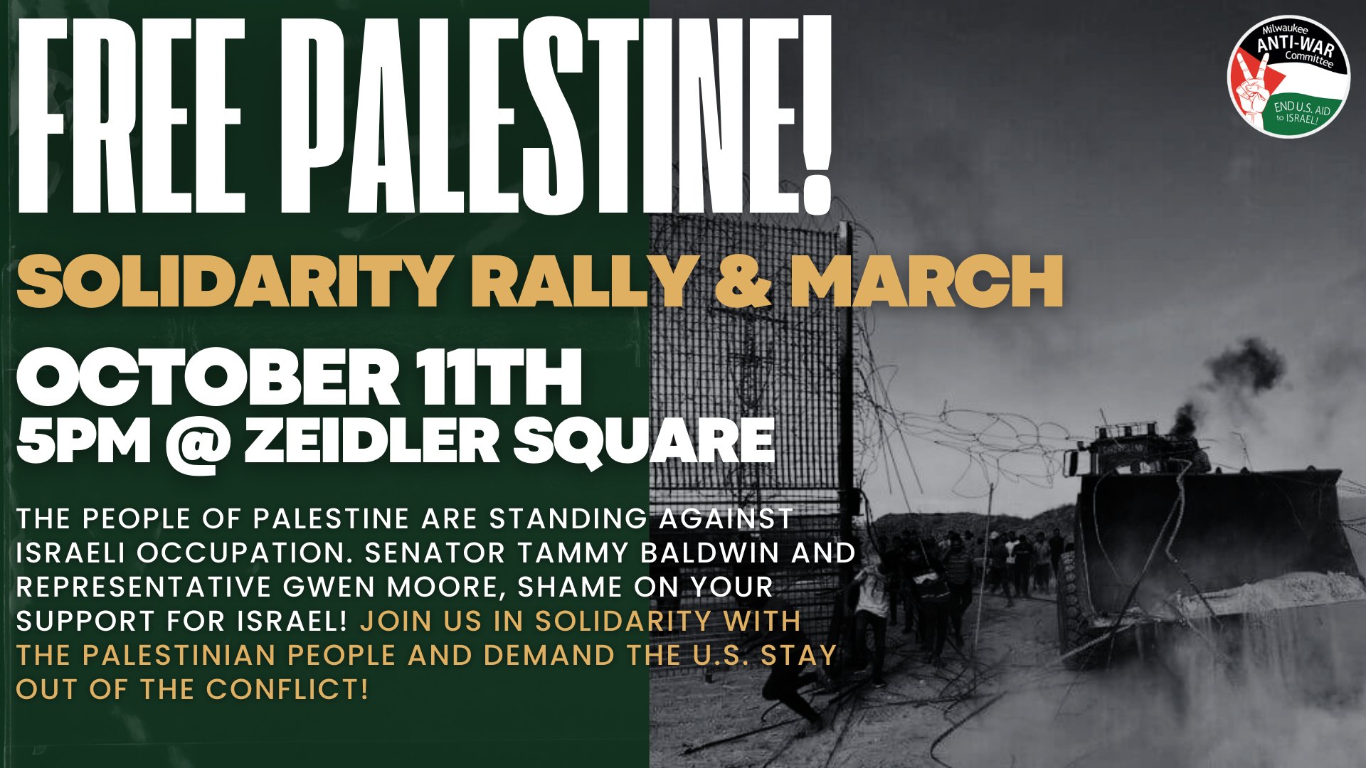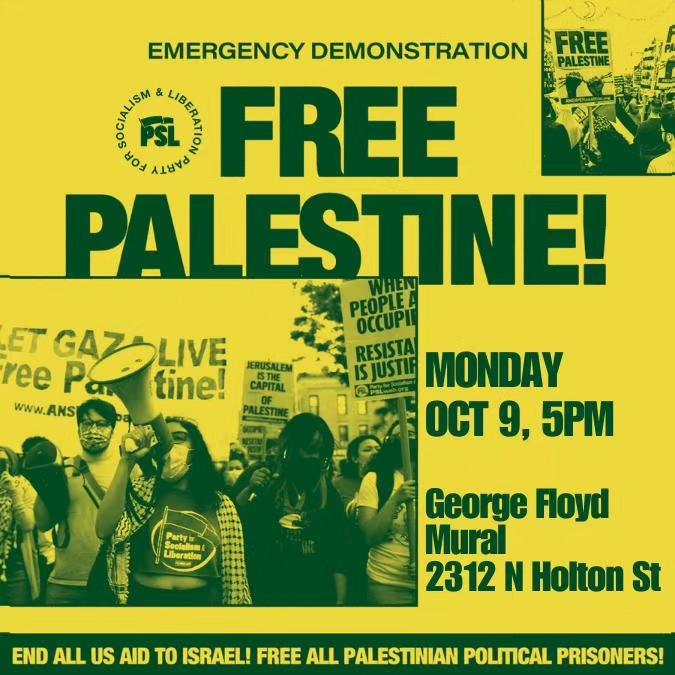Categories Uncategorized Milwaukee October 9 and October 11, 2023: Free Palestine! End U.S.-Israeli Apartheid Protests! Post author By wibailoutpeople Post date October 9, 2023 Share this: Share on X (Opens in new window) X Share on Facebook (Opens in new window) Facebook Like Loading... Related ← Victory to Palestine! – Resistance Isn’t Terrorism! → UNAC Statement: Free Palestine! Resistance is Justified When People Are Occupied!