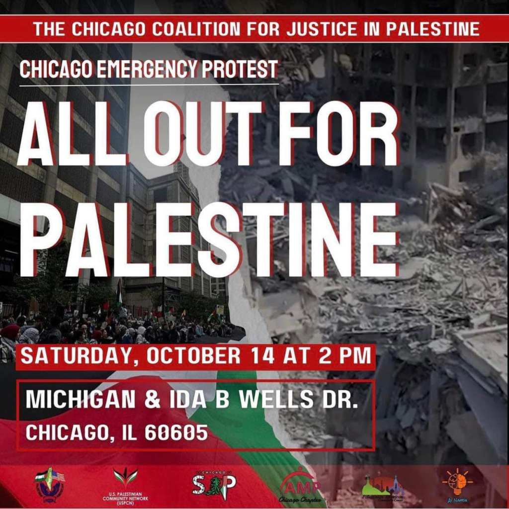 Categories Uncategorized Chicago Emergency Protest October 14, 2023: All Out For Palestine! Post author By wibailoutpeople Post date October 14, 2023 Share this: Share on X (Opens in new window) X Share on Facebook (Opens in new window) Facebook Like Loading... Related ← Biden Deploys Secretary of State to Israel – Despite the blatant violations of international law by Tel Aviv, the White House reinforces the efforts to obliterate the Palestinian people in Gaza → Minneapolis, October 15, 2023: March for Palestine!