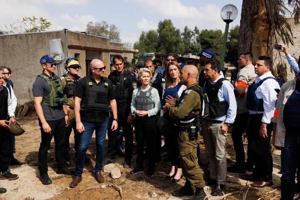EXCLUSIVE: October 13, 2023 – Kfar Aza, Israel: President of the European Commission Ursula von der Leyen is touring Kfar Aza Kibbutz with high-rank IDF and police commanders to see the destruction caused by the Hamas terrorists. Seventh day to the attack of Hamas on Israel. Seventh day to the attack of Hamas on Israel. Starting early in the morning of October 7th, missiles were shot to Israel from Gaza while Hamas terrorists invade Israeli settlements around Gaza, murdering and kidnapping dozens, including children. (Ziv Koren Polaris)
