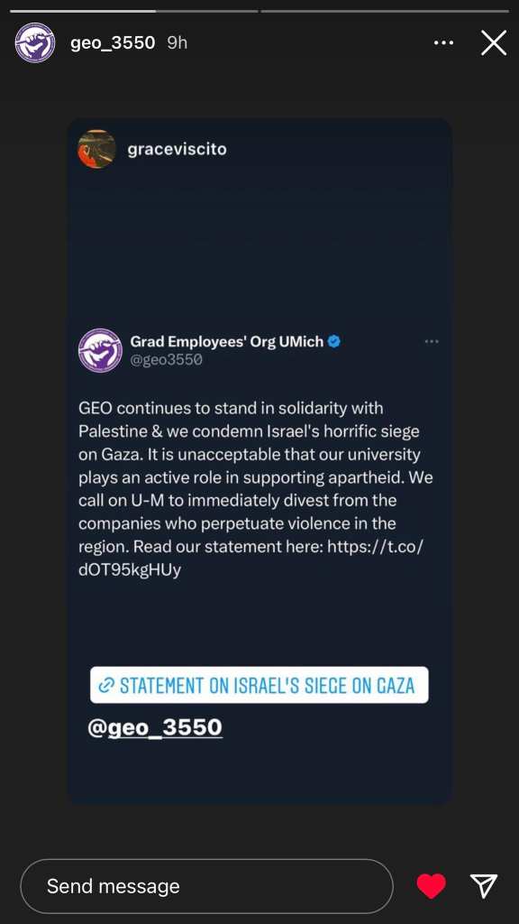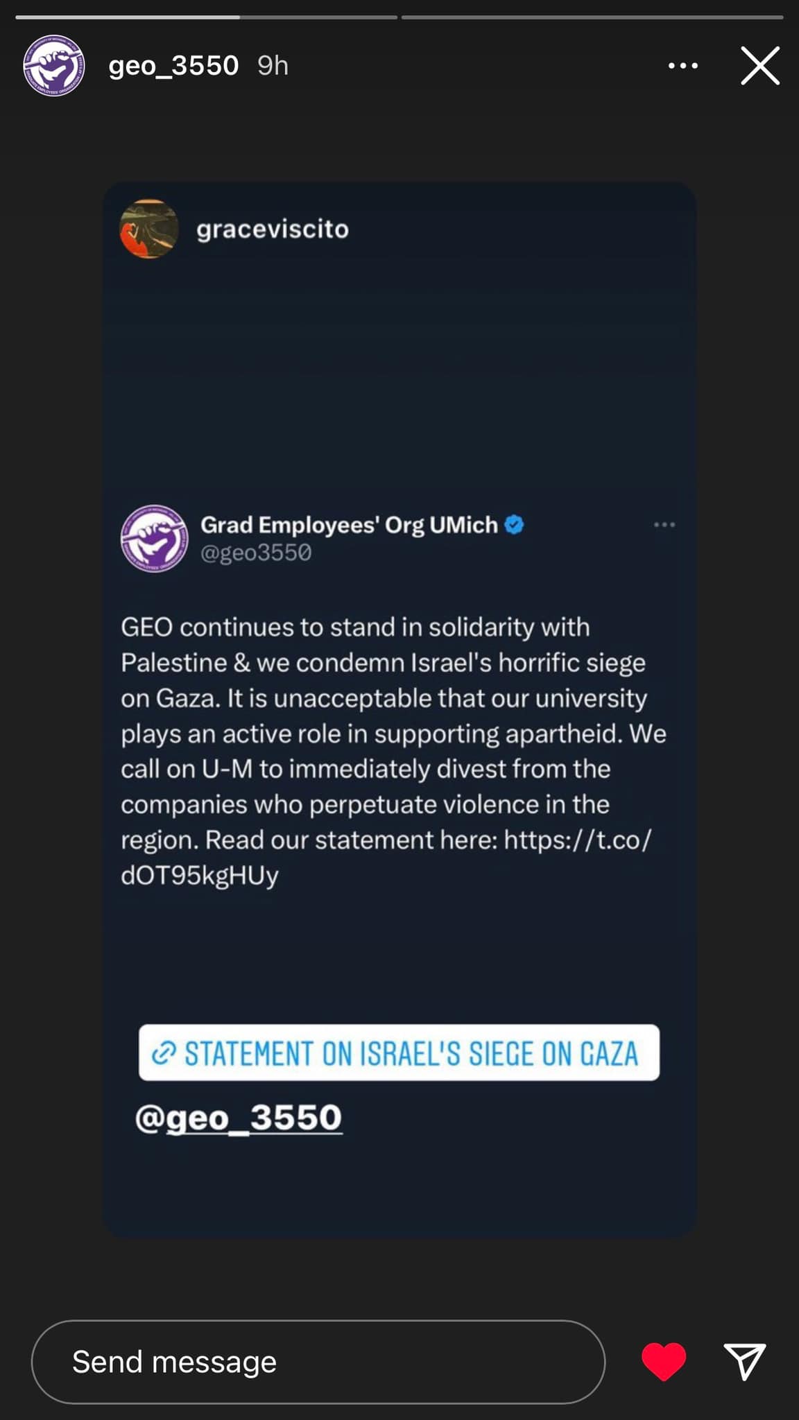 Categories Uncategorized GEO 3550 Stands With Palestine! Post author By wibailoutpeople Post date October 14, 2023 Graduate Employees’ Organization 3550 Share this: Share on X (Opens in new window) X Share on Facebook (Opens in new window) Facebook Like Loading... Related ← Minneapolis, October 15, 2023: March for Palestine! → Dearborn/Detroit Rally October 14, 2023: All Out for Palestine!