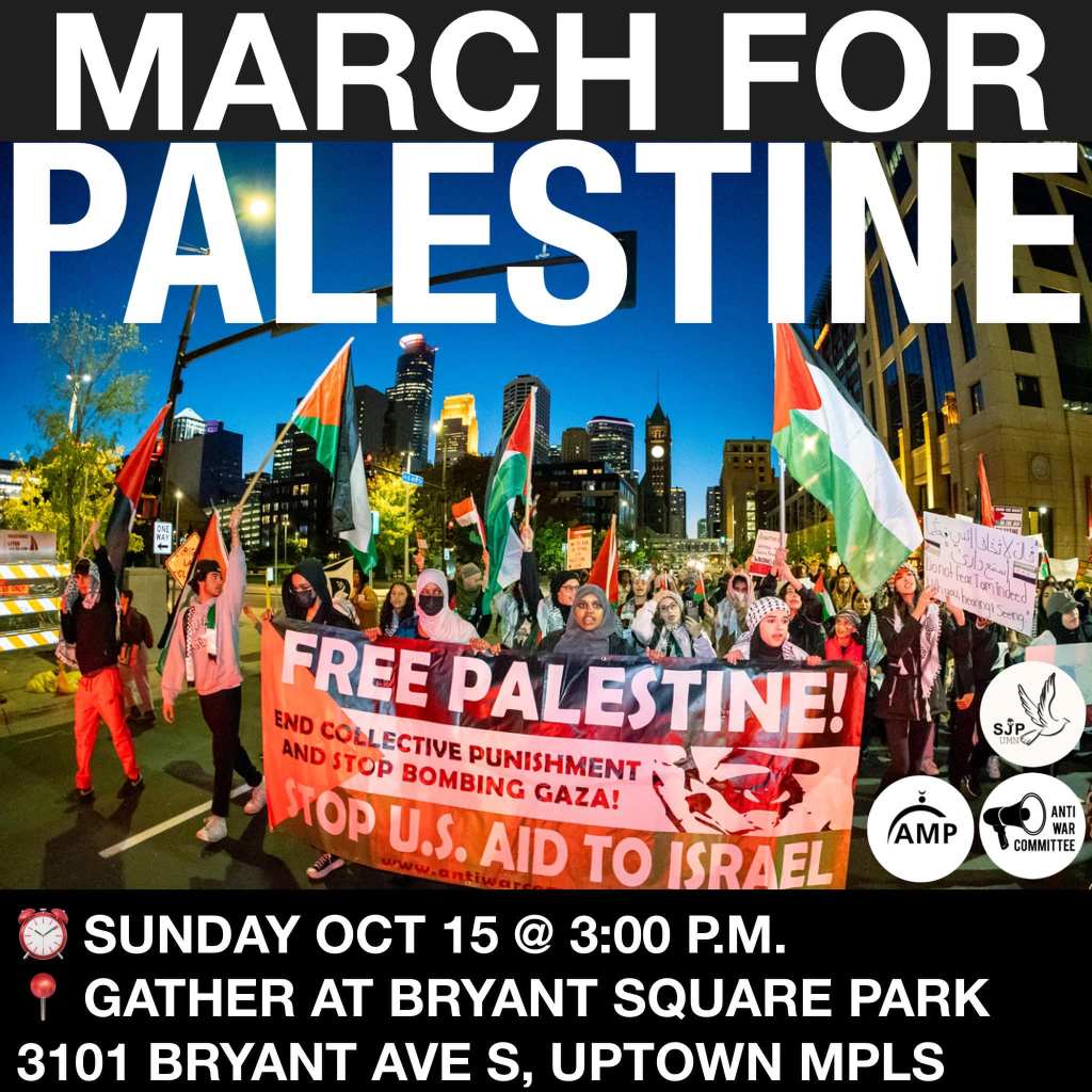 Categories Uncategorized Minneapolis, October 15, 2023: March for Palestine! Post author By wibailoutpeople Post date October 14, 2023 Share this: Share on X (Opens in new window) X Share on Facebook (Opens in new window) Facebook Like Loading... Related ← Chicago Emergency Protest October 14, 2023: All Out For Palestine! → GEO 3550 Stands With Palestine!
