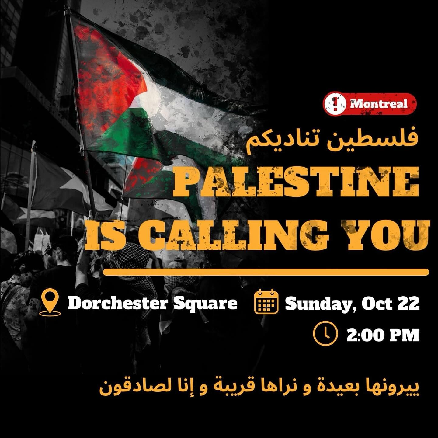 Join us this Sunday, Oct 22 to demand an immediate end to this genocidal campaign by the zionist entity, its US sponsored bombs and Canada’s complete approval.