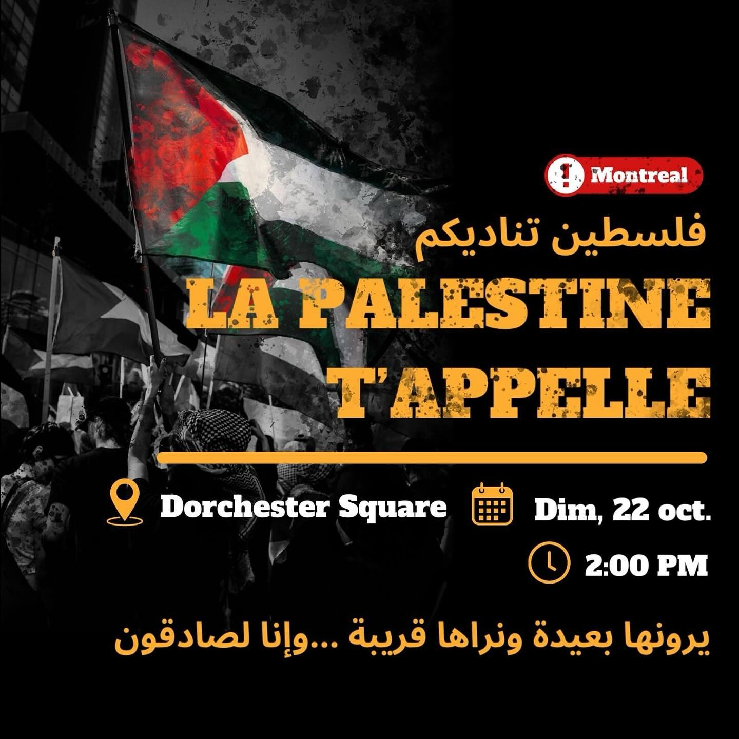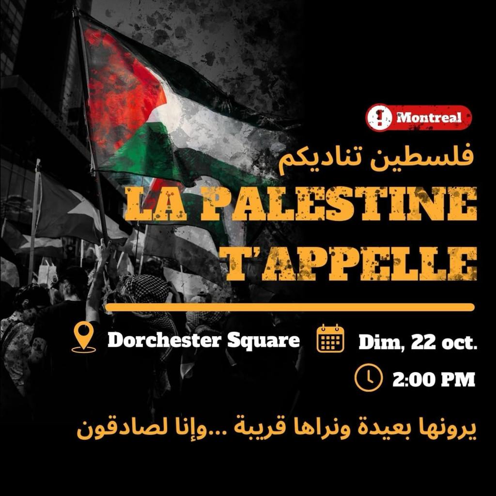Rejoignez-nous ce dimanche 22 octobre pour exiger l’arrêt immédiat de cette campagne génocidaire de l’entité sioniste, de ses bombes sponsorisées par les Etats-Unis et de l’approbation totale du Canada.