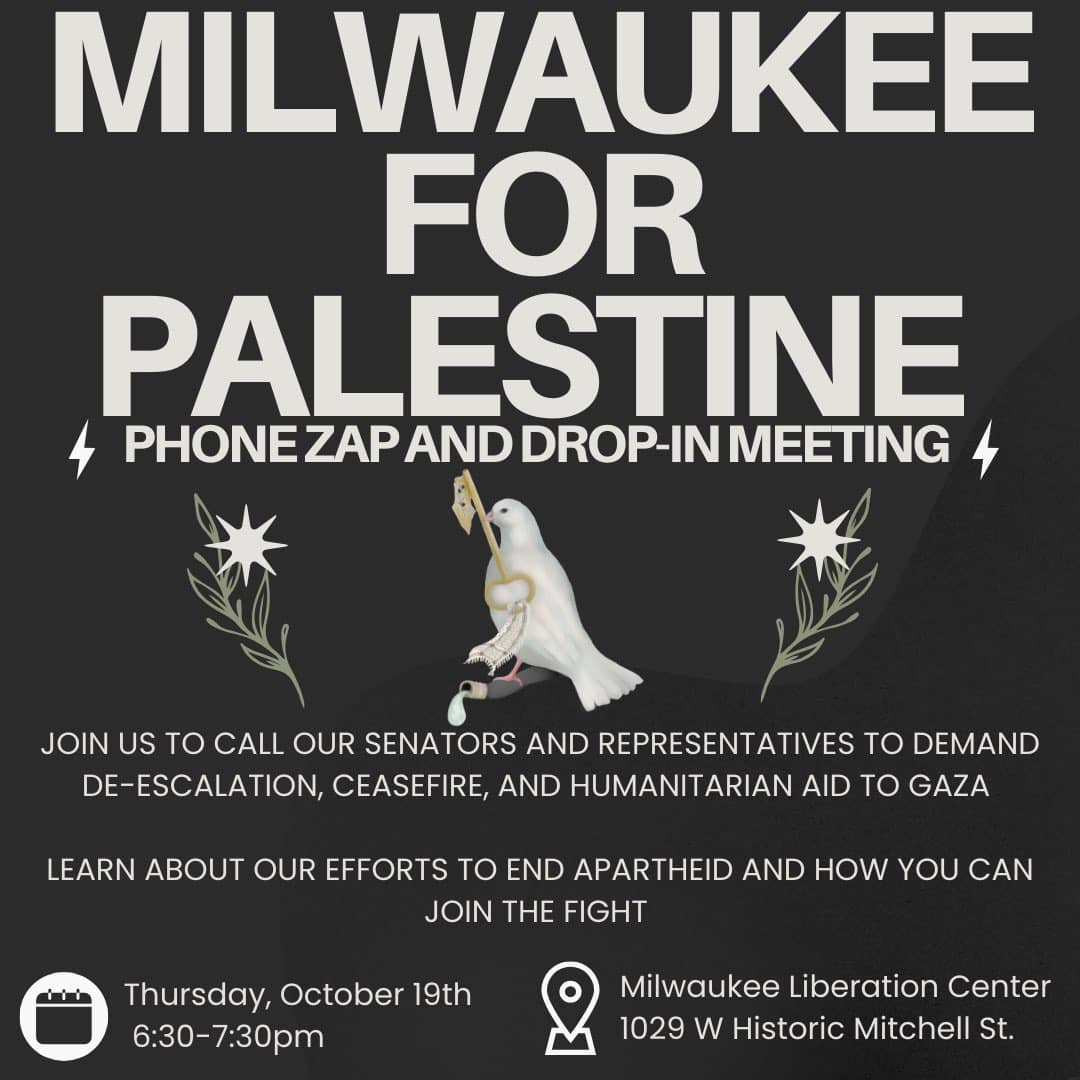 Categories Uncategorized Milwaukee, October 19, 2023: Phone Zap and Drop-In Meeting Call Politicians to Stop U.S.-Israeli Genocidal Apartheid on Palestine! Post author By wibailoutpeople Post date October 19, 2023 Share this: Share on X (Opens in new window) X Share on Facebook (Opens in new window) Facebook Like Loading... Related ← Madison, October 20, 2023: ALL OUT FOR PALESTINE! → Wisconsin: Free Palestine! Actions October 19-22, 2023 (Madison, Milwaukee, Green Bay)