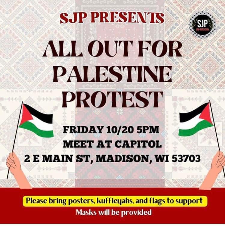 Categories Uncategorized Madison, October 20, 2023: ALL OUT FOR PALESTINE! Post author By wibailoutpeople Post date October 20, 2023 Share this: Share on X (Opens in new window) X Share on Facebook (Opens in new window) Facebook Like Loading... Related ← Milwaukee, October 20, 2023: Wartime Rhetoric, Why State and Media Narratives Matter → Media: Who to Follow in and From Gaza
