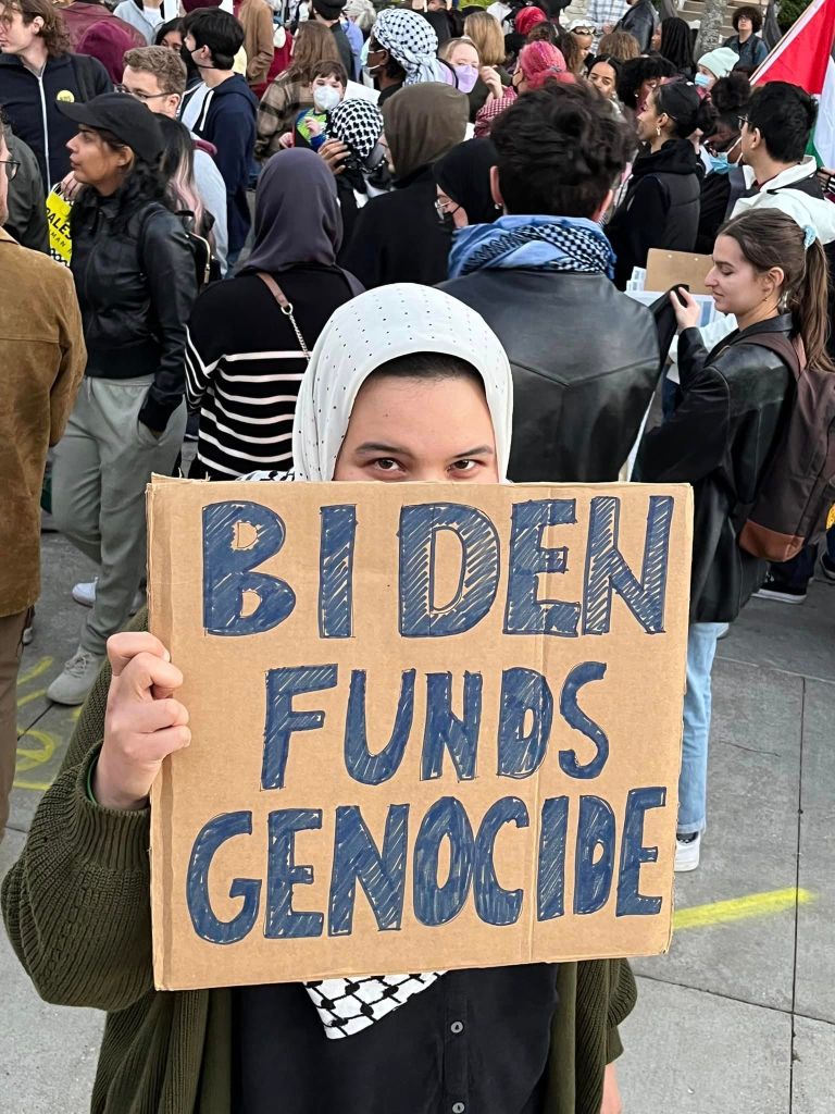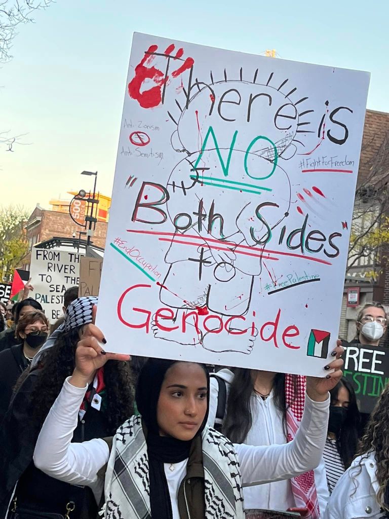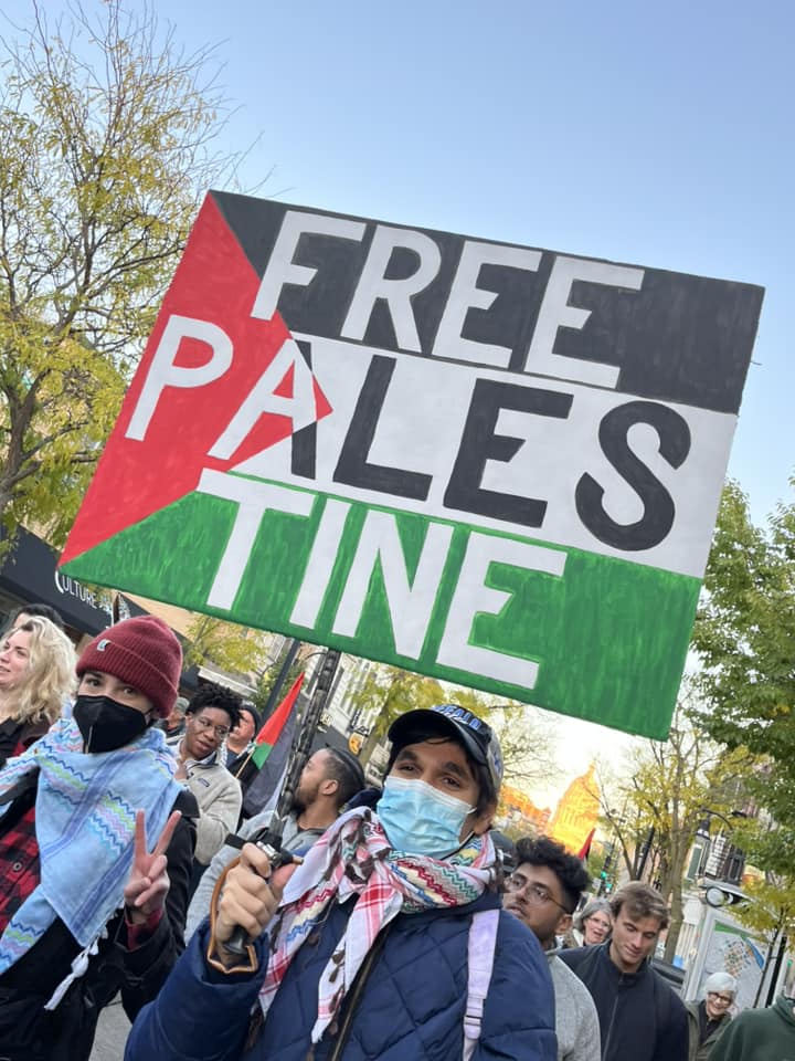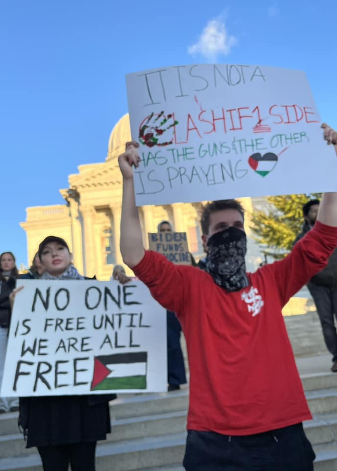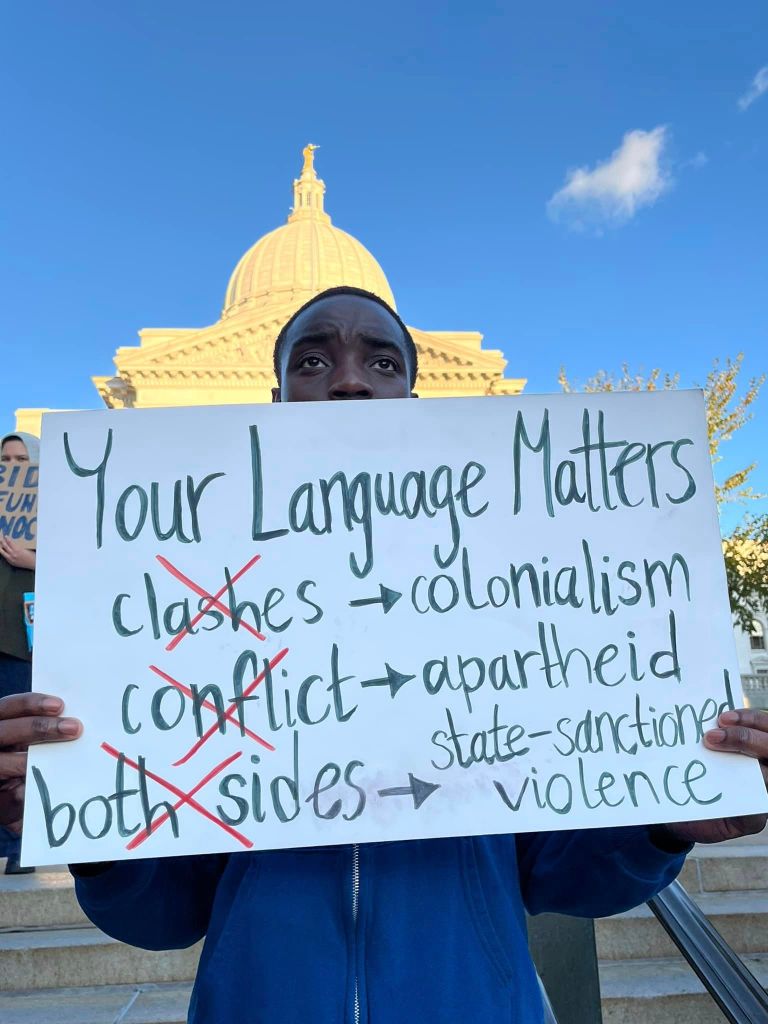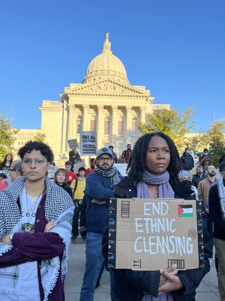 A diverse crowd of hundreds of students, workers and community members led by Students for Justice in Palestine, rallied at the State Capitol in Madison October 20, 2023. At numerous rallies and a march down and back up State Street, protesters made their demands clear: An immediate end to the U.S.-Israeli genocidal apartheid of Palestinians! A rainbow of individuals and many organizations supported the Arab and Muslim students leading the march. Other actions are planned for Madison. See: Madison-Rafah Sister City Project