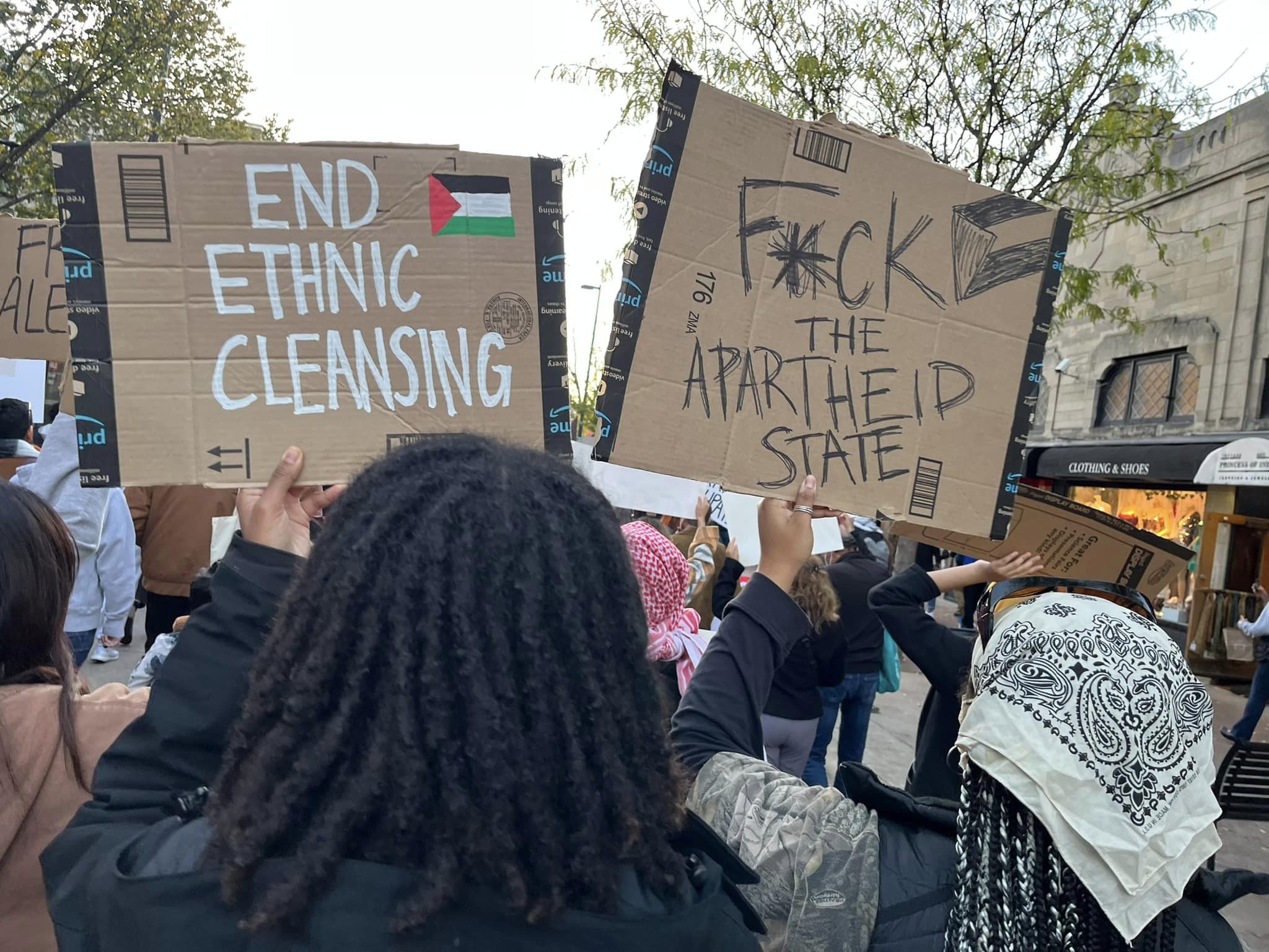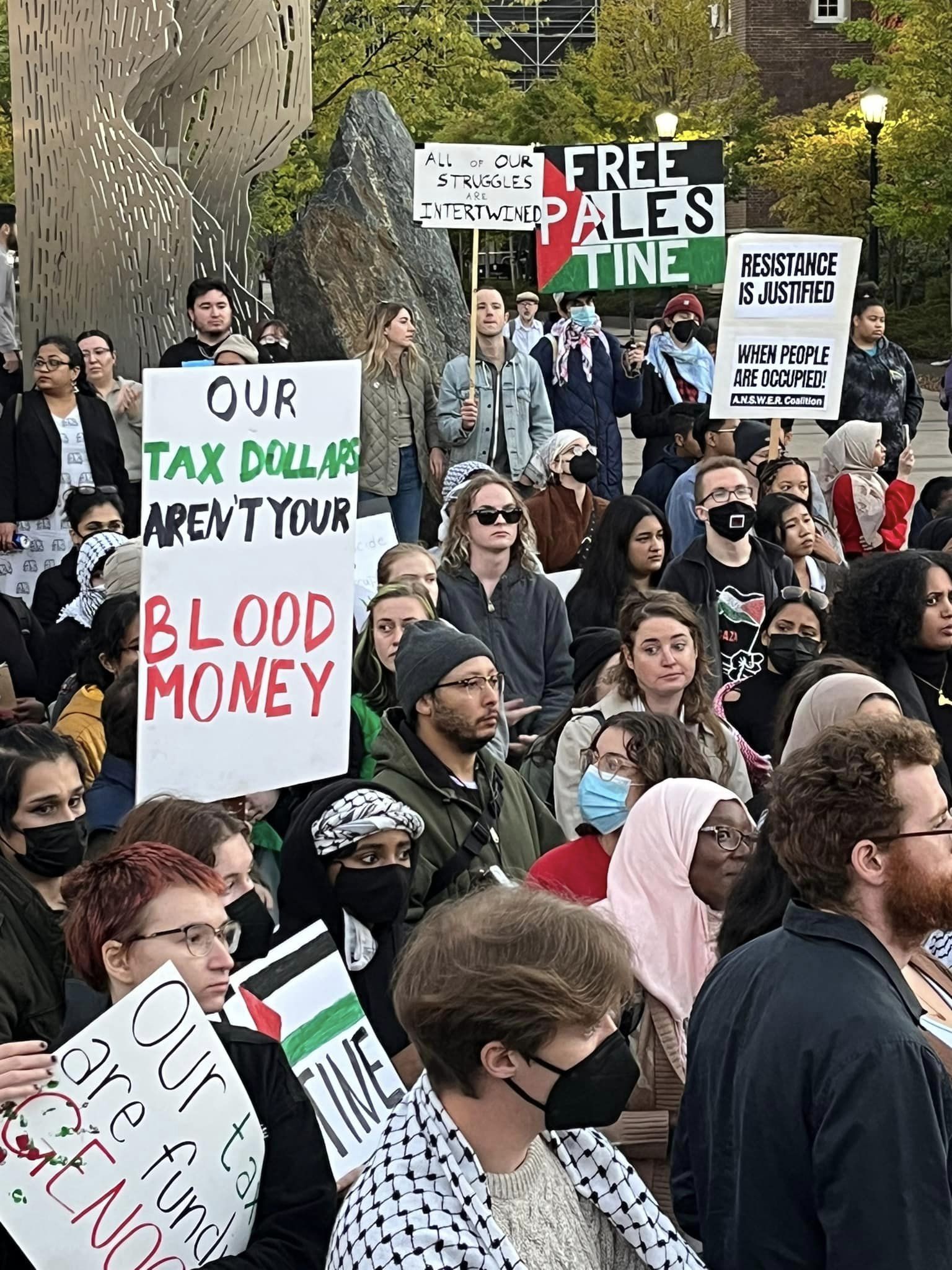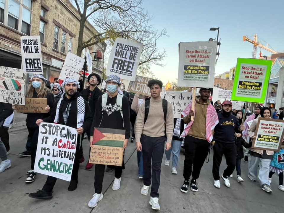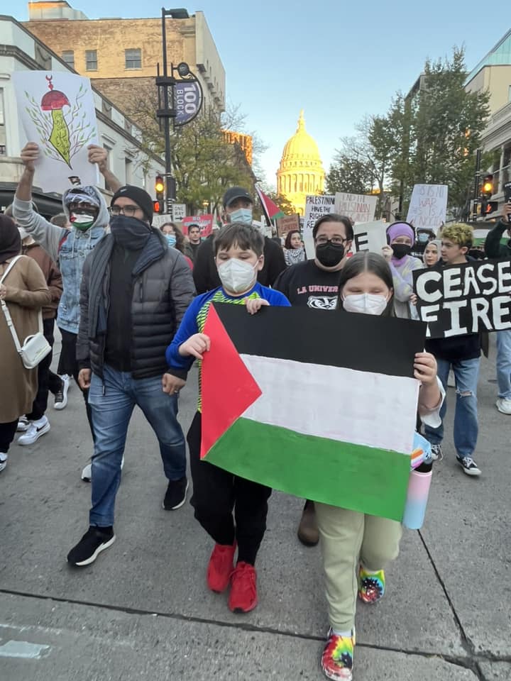 A diverse crowd of hundreds of students, workers and community members led by Students for Justice in Palestine, rallied at the State Capitol in Madison October 20, 2023. At numerous rallies and a march down and back up State Street, protesters made their demands clear: An immediate end to the U.S.-Israeli genocidal apartheid of Palestinians! A rainbow of individuals and many organizations supported the Arab and Muslim students leading the march. Other actions are planned for Madison. See: Madison-Rafah Sister City Project