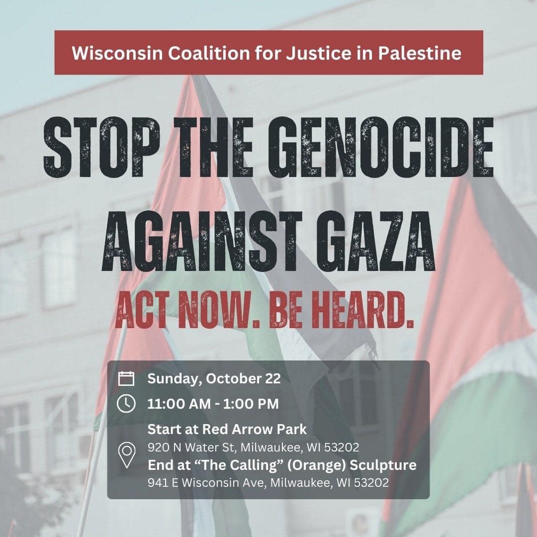 Categories Uncategorized Milwaukee, October 22, 2023: Stop the Genocide Against Gaza! Free Palestine March & Rally Post author By wibailoutpeople Post date October 22, 2023 Share this: Share on X (Opens in new window) X Share on Facebook (Opens in new window) Facebook Like Loading... Related ← Millions Demonstrate Around the World in Solidarity with Palestine → UAW Strikes Continue! Join a Picket Line Near You!