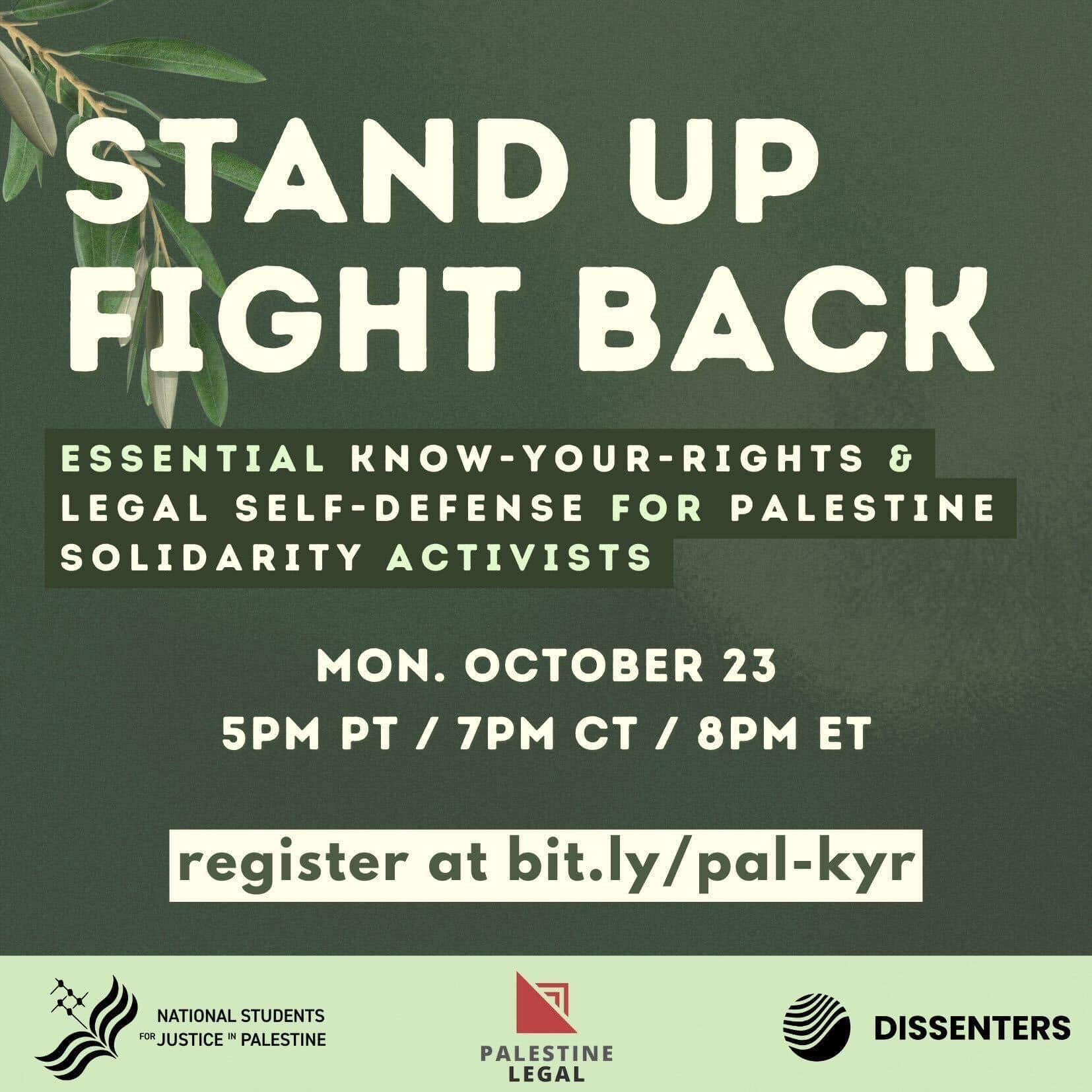 Categories Uncategorized October 23, 20923: Know Your Rights Training for Palestine Solidarity Activists Post author By wibailoutpeople Post date October 22, 2023 Share this: Share on X (Opens in new window) X Share on Facebook (Opens in new window) Facebook Like Loading... Related ← October 25, 2023: National Student Walkout for Palestine! → Malcolm X on Palestine