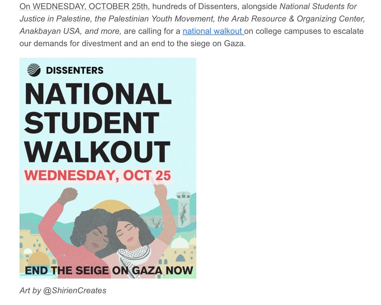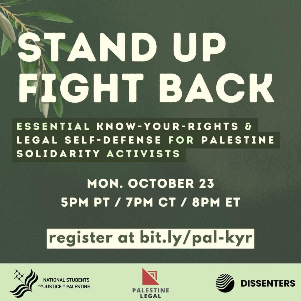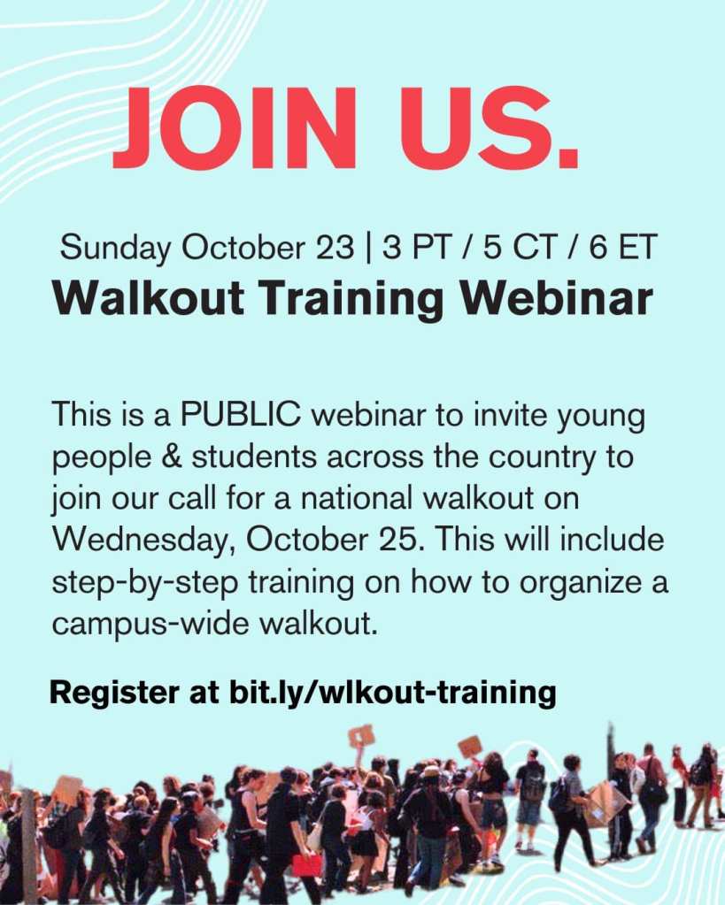 Categories Uncategorized October 25, 2023: National Student Walkout for Palestine! Post author By wibailoutpeople Post date October 22, 2023 Palestinian Youth Movement (PYM)- حركة الشباب الفلسطيني Share this: Share on X (Opens in new window) X Share on Facebook (Opens in new window) Facebook Like Loading... Related ← We Rise Fighting! Labor Podcast → October 23, 20923: Know Your Rights Training for Palestine Solidarity Activists