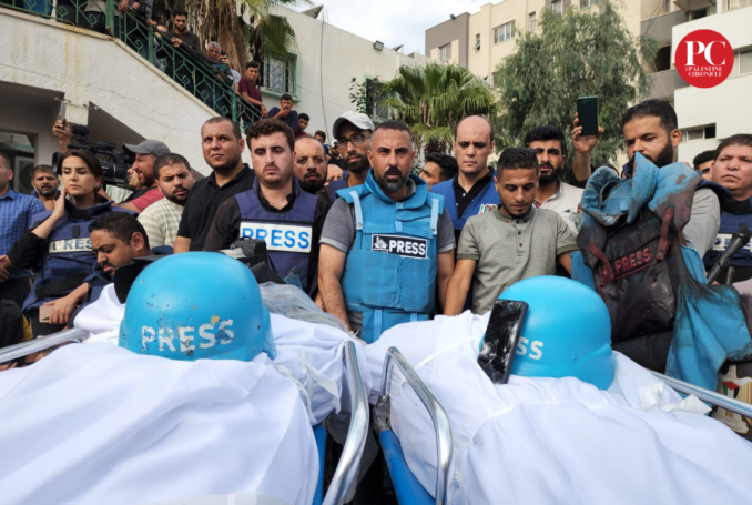 The funeral of two Palestinian journalists killed by Israeli forces in Gaza. At least 16 Palestinian journalist have been murdered by the U.S. funded Israeli IDF forces and other journalists from across the world have been targeted, murdered and maimed as well. (Photo: Mahmoud Ajjour, The Palestine Chronicle)