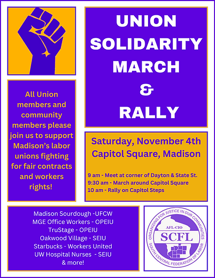 Categories Uncategorized Madison, November 4, 2023 Union & Community Solidarity March & Rally! Post author By wibailoutpeople Post date October 25, 2023 Facebook Eventhttps://www.facebook.com/events/278151431792951 Share this: Share on X (Opens in new window) X Share on Facebook (Opens in new window) Facebook Like Loading... Related ← 6,800 More UAW Members Stand Up and Strike → Worker Justice Wisconsin: El Chisme Co-Op Launch October 25, 2023 in Madison