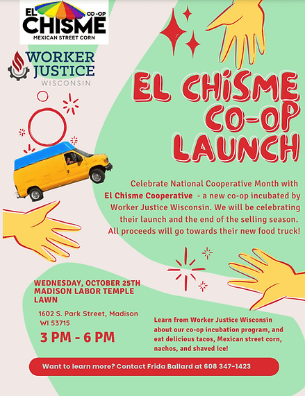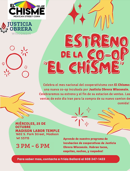 Categories Uncategorized Worker Justice Wisconsin: El Chisme Co-Op Launch October 25, 2023 in Madison Post author By wibailoutpeople Post date October 25, 2023 Worker Justice Wisconsin Worker Justice Wisconsin Share this: Click to share on X (Opens in new window) X Click to share on Facebook (Opens in new window) Facebook Like Loading... Related ← Madison, November 4, 2023 Union & Community Solidarity March & Rally! → Madison, Wisconsin: South Central Federation of Labor’s Young Workers Committee October 30, 2023