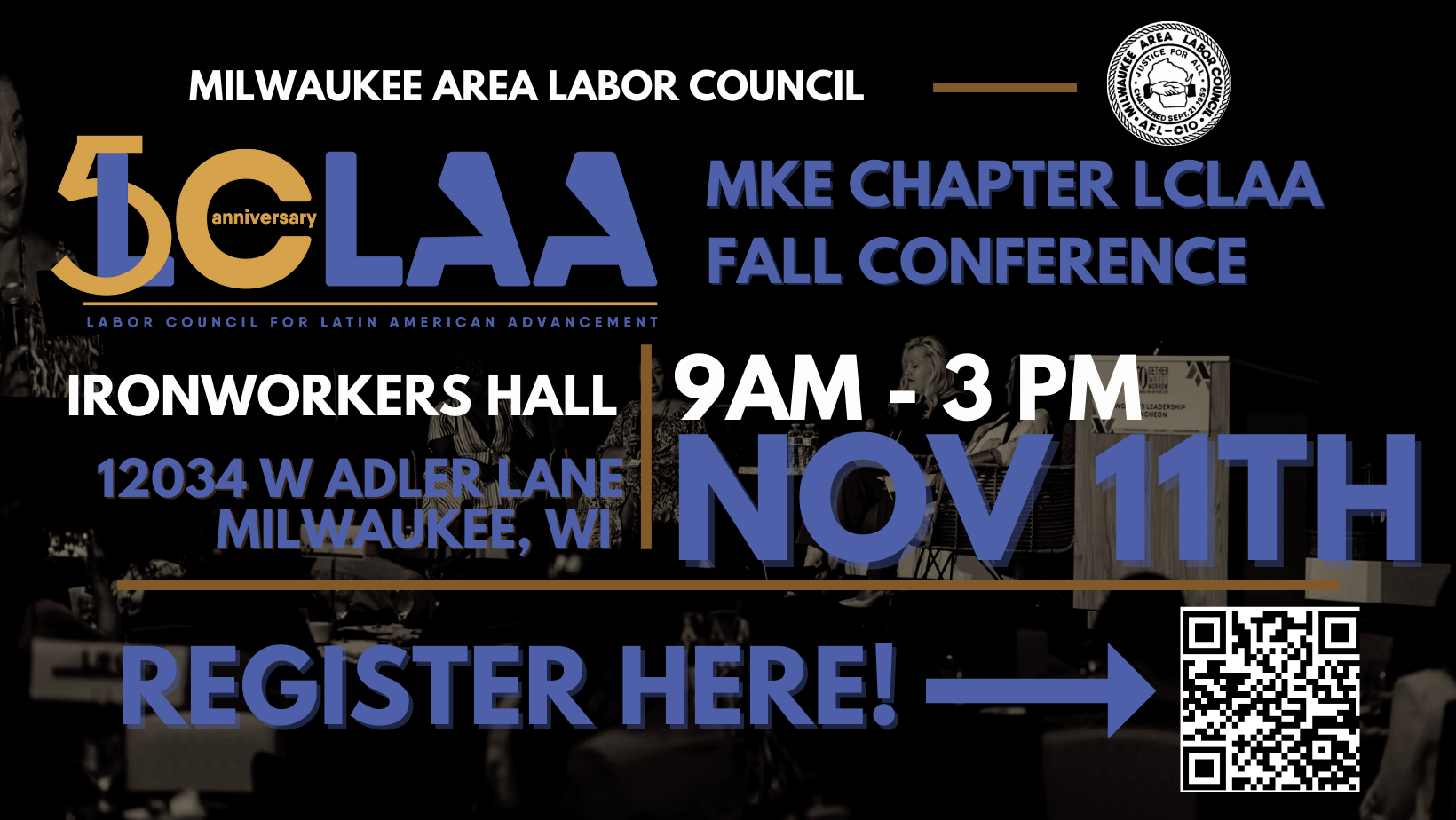 This year LCLAA will be hosting its Bi-Annual Conference at the Ironworkers Hall. This conference will be held on Saturday, November 11th, from 9 am-3 pm. To support the work being done by Latinx union members in the labor movement and in the community, we are asking local unions to commit to attending the conference of LCLAA Milwaukee.