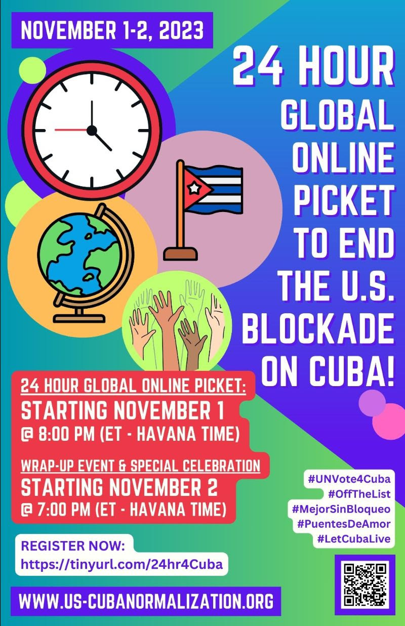 Categories Uncategorized November 1-2, 2023: 24-HOUR GLOBAL ONLINE PICKET TO END THE U.S. BLOCKADE ON CUBA! Post author By wibailoutpeople Post date October 31, 2023 Starting on Nov 1, 2023 07:00 PM (CT) To Thursday, Nov. 2, 8:00 pm (CT) REGISTER Share this: Click to share on X (Opens in new window) X Click to share on Facebook (Opens in new window) Facebook Like Loading... Related ← The U.S. and Israel Slaughter One Child Every 10 Minutes! → Joint statement of Palestinian resistance: ‘We hold U.S. fully responsible’