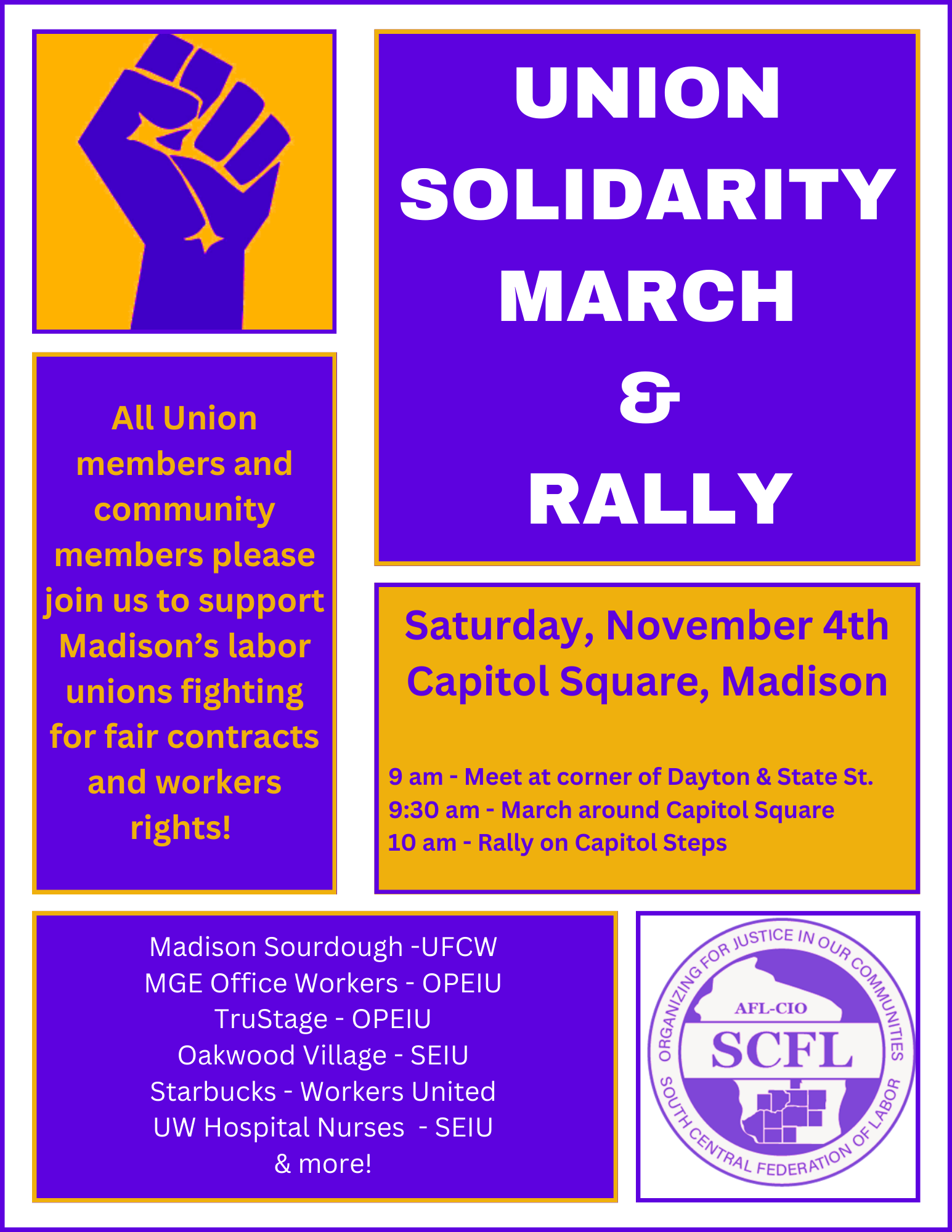 Categories Uncategorized Madison, November 4, 2023: Union & Community Solidarity March and Rally Post author By wibailoutpeople Post date November 1, 2023 Facebook here: https://facebook.com/events/s/union-solidarity-march-rally/278151431792951/ Share this: Click to share on X (Opens in new window) X Click to share on Facebook (Opens in new window) Facebook Like Loading... Related ← Madison, November 1, 2023: All Out for Palestine! All Out Against the Illegal U.S.-Israeli Slaughter of Palestinians! → 24 Hour Global Online Picket to End the U.S. Blockade on Cuba November 1-2, 2023