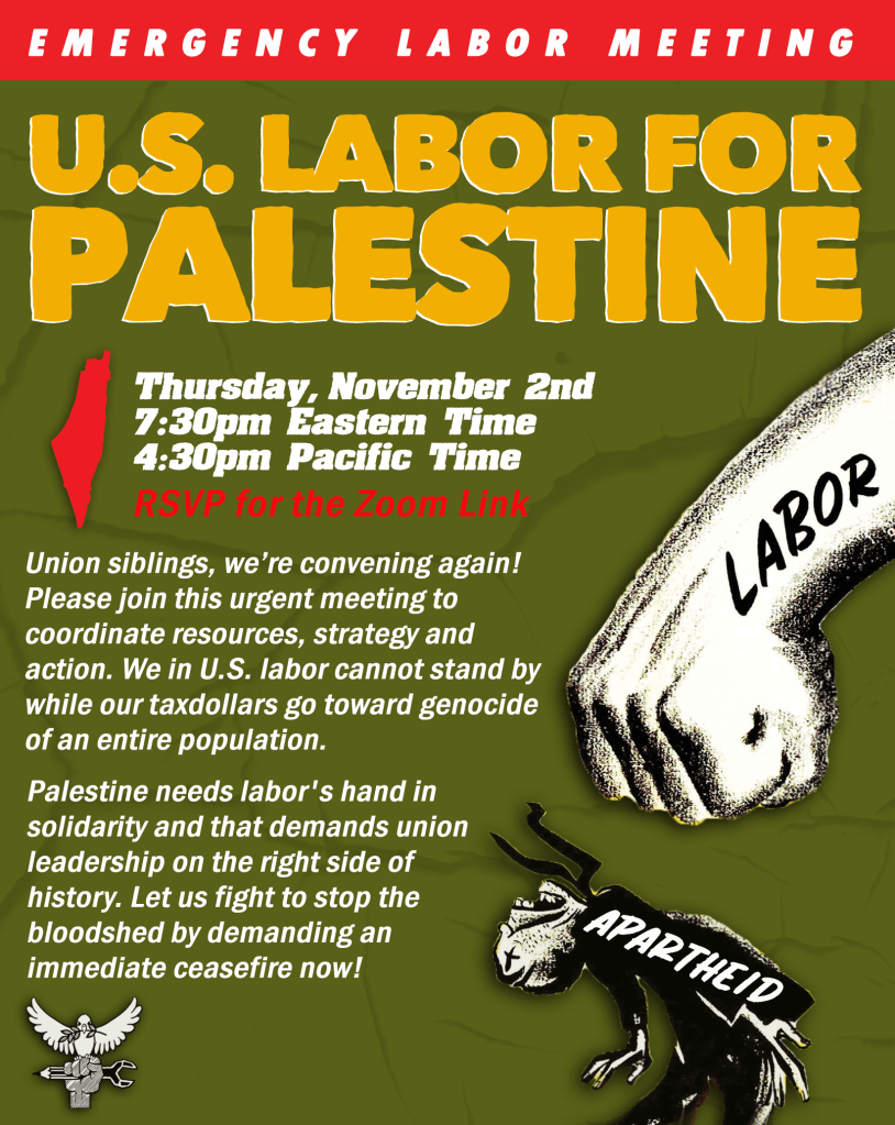 1. Join us for the Emergency Labor Meeting for Palestine today November 2nd, at 7:30 ET. Please register now! We will hear critical reports from workers across the labor movement organizing for Palestine, and collectively map out our next steps.