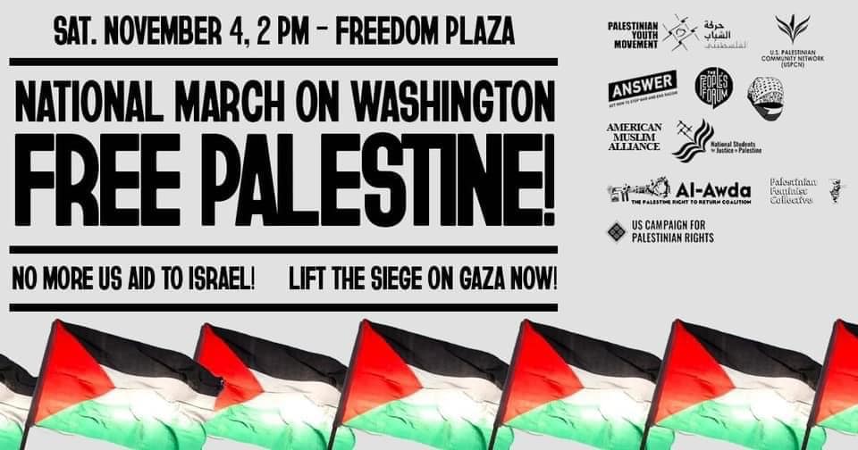 Categories Uncategorized Washington D.C., Novembere 4, 2023: National March, Free Palestine! – No More U.S. Aid to Apartheid Israel! – Stop the U.S.-Israeli Massacres NOW! Post author By wibailoutpeople Post date November 3, 2023 Share this: Click to share on X (Opens in new window) X Click to share on Facebook (Opens in new window) Facebook Like Loading... Related ← Let Cuba Live Petition → Washington D.C., November 4, 2023: Black People’s March on the White House