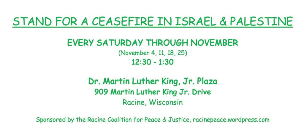 Categories Uncategorized Racine Stand For Peace November 4, 2023: Stop U.S. Tax $$$ to Murder Palestinians! – Palestina Libre! Post author By wibailoutpeople Post date November 4, 2023 Racine Coalition for Peace and Justice https://racinepeace.wordpress.com/ Share this: Share on X (Opens in new window) X Share on Facebook (Opens in new window) Facebook Like Loading... Related ← Pro-Palestine supporters block US ship loaded with arms for ‘Israel’ → Green Bay, WI November 4, 2023: Protesters Demand, ‘End U.S. Support for Genocide! – Stop U.S.-Israeli Apartheid!’