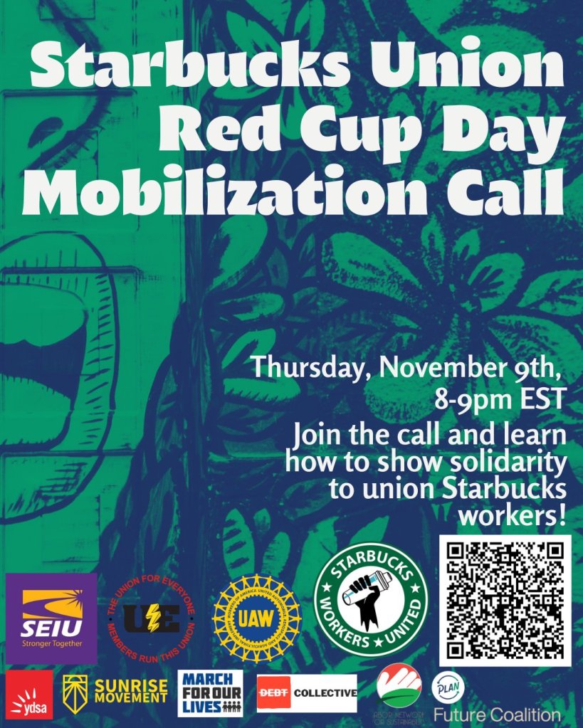 Categories Uncategorized Madison, November 16, 2023: Starbucks Strike Caravan on Red Cup Rebellion Day! Post author By wibailoutpeople Post date November 5, 2023 https://www.scfl.org/ South Central Federation of Labor SBWorkersUnited Share this: Share on X (Opens in new window) X Share on Facebook (Opens in new window) Facebook Like Loading... Related ← Milwaukee: Experis Workers Announce Union Effort → Send an email to your Senator and Representative to demand No War Funding! No more war in Palestine and Ukraine! No new Invasion of Haiti!