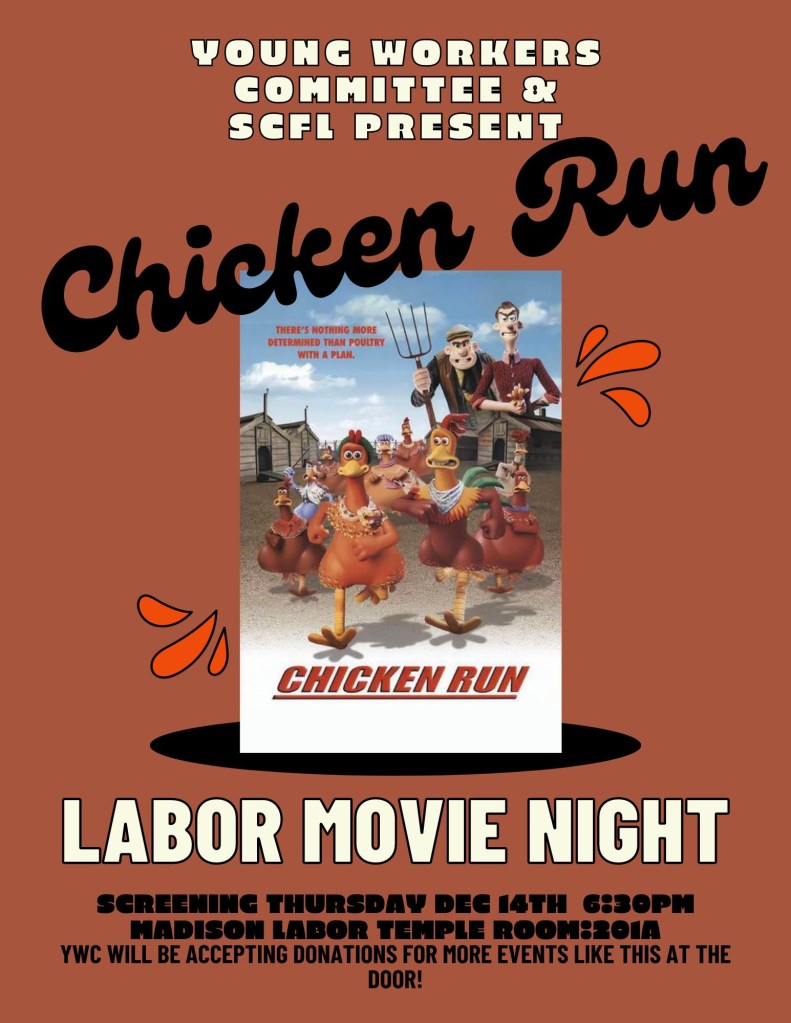Categories Uncategorized Young Workers Committee and SCFL Present a Film Screening of ‘Chicken Run’ December 14, 2023 Post author By wibailoutpeople Post date November 7, 2023 Share this: Share on X (Opens in new window) X Share on Facebook (Opens in new window) Facebook Like Loading... Related ← Monona, WI November 8, 2023: Demand Respect and a Living Wage for Para Educators! → National Statement of Black Lawyers Statement on Palestine