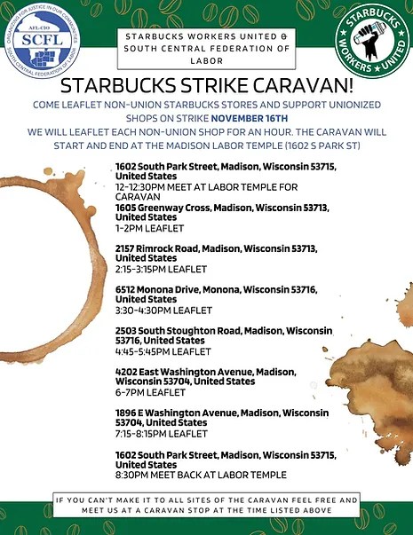 Categories Uncategorized Madison, Starbucks Workers Strike Caravan! November 16, 2023 Post author By wibailoutpeople Post date November 9, 2023 South Central Federation of Labor https://www.scfl.org/ Share this: Share on X (Opens in new window) X Share on Facebook (Opens in new window) Facebook Like Loading... Related ← Jewish Voice for Peace – Milwaukee: ‘Jews Say, Stop the Genocide of Palestinians!’ → Michael Parenti speech on Empire & Neo-Imperialism