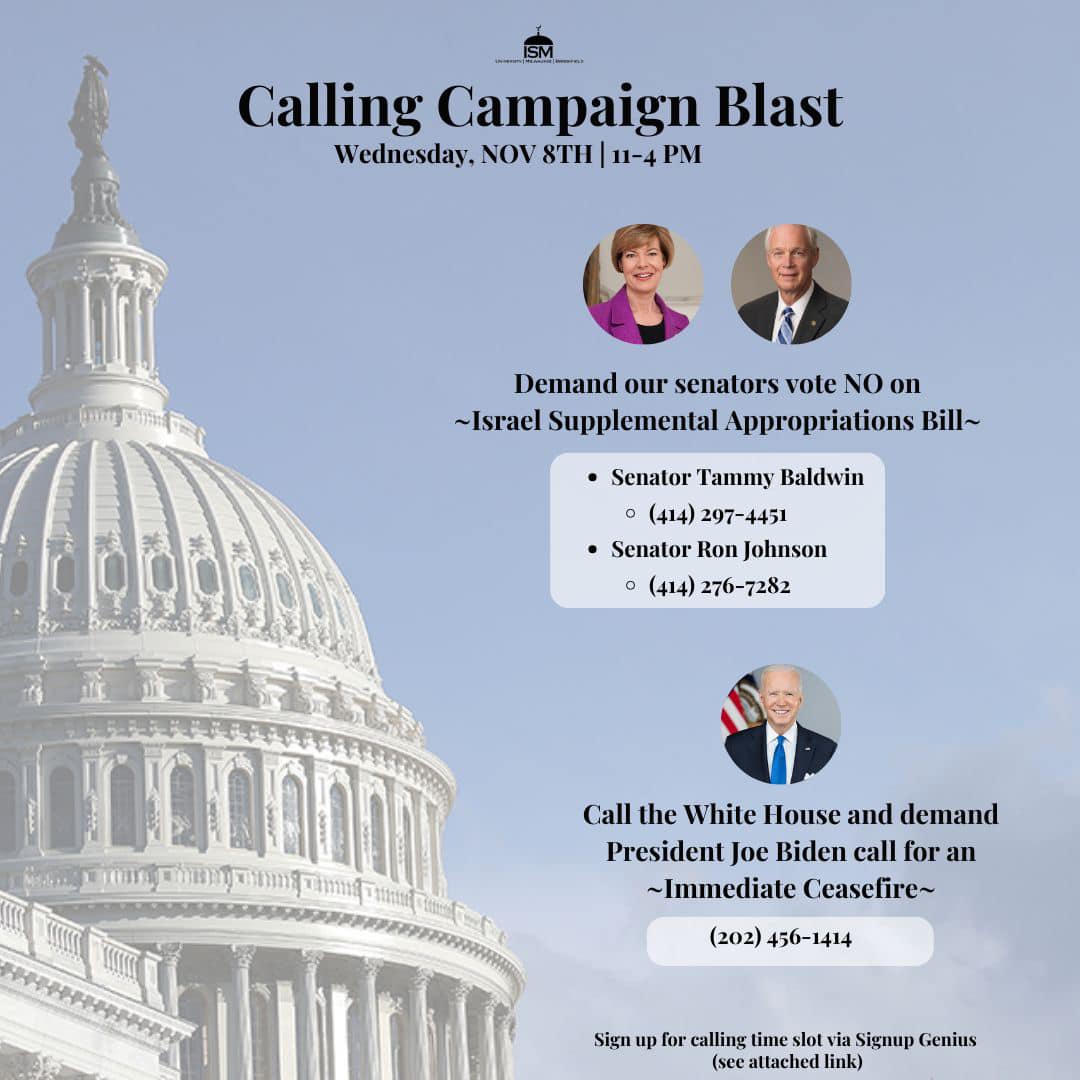 Categories Uncategorized Milwaukee, November 10, 2023: Banner Drop Protest, Stop U.S. Aid to Israel! – Stop the Massacres of Palestinians! Post author By wibailoutpeople Post date November 9, 2023 Islamic Society of Milwaukee Share this: Share on X (Opens in new window) X Share on Facebook (Opens in new window) Facebook Like Loading... Related ← Madison, November 9, 2023: SHUT IT DOWN FOR PALESTINE! – State Capitol → Jewish Voice for Peace – Milwaukee: ‘Jews Say, Stop the Genocide of Palestinians!’