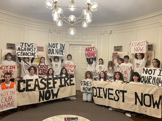 are occupying Pres. Christina Paxton’s office demanding Brown do its part to promote an immediate ceasefire and a lasting peace by divesting its endowment from companies that enable war crimes in Gaza.