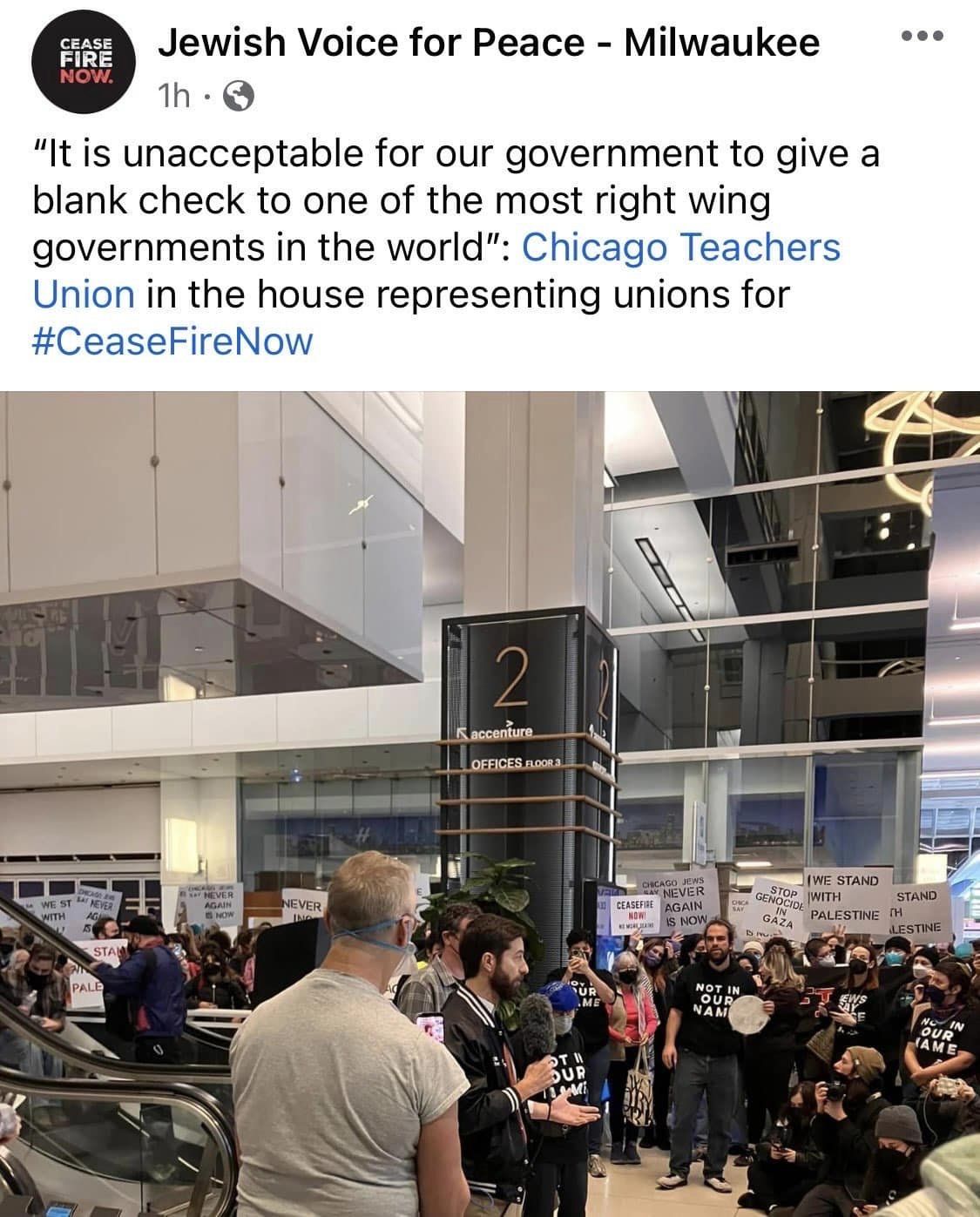Categories Uncategorized Midwest Jews in Chicago to Demand an End to U.S.-Israeli Genocide! Ceasefire Now! Post author By wibailoutpeople Post date November 13, 2023 Jewish Voice for Peace – Milwaukee #CeasefireForGaza Jewish Voice for Peace-Chicago Share this: Share on X (Opens in new window) X Share on Facebook (Opens in new window) Facebook Like Loading... Related ← Justice for Joel Acevedo! – JAIL KILLER COPS! → American Postal Workers Union (APWU) Calls for a Ceasefire in Gaza