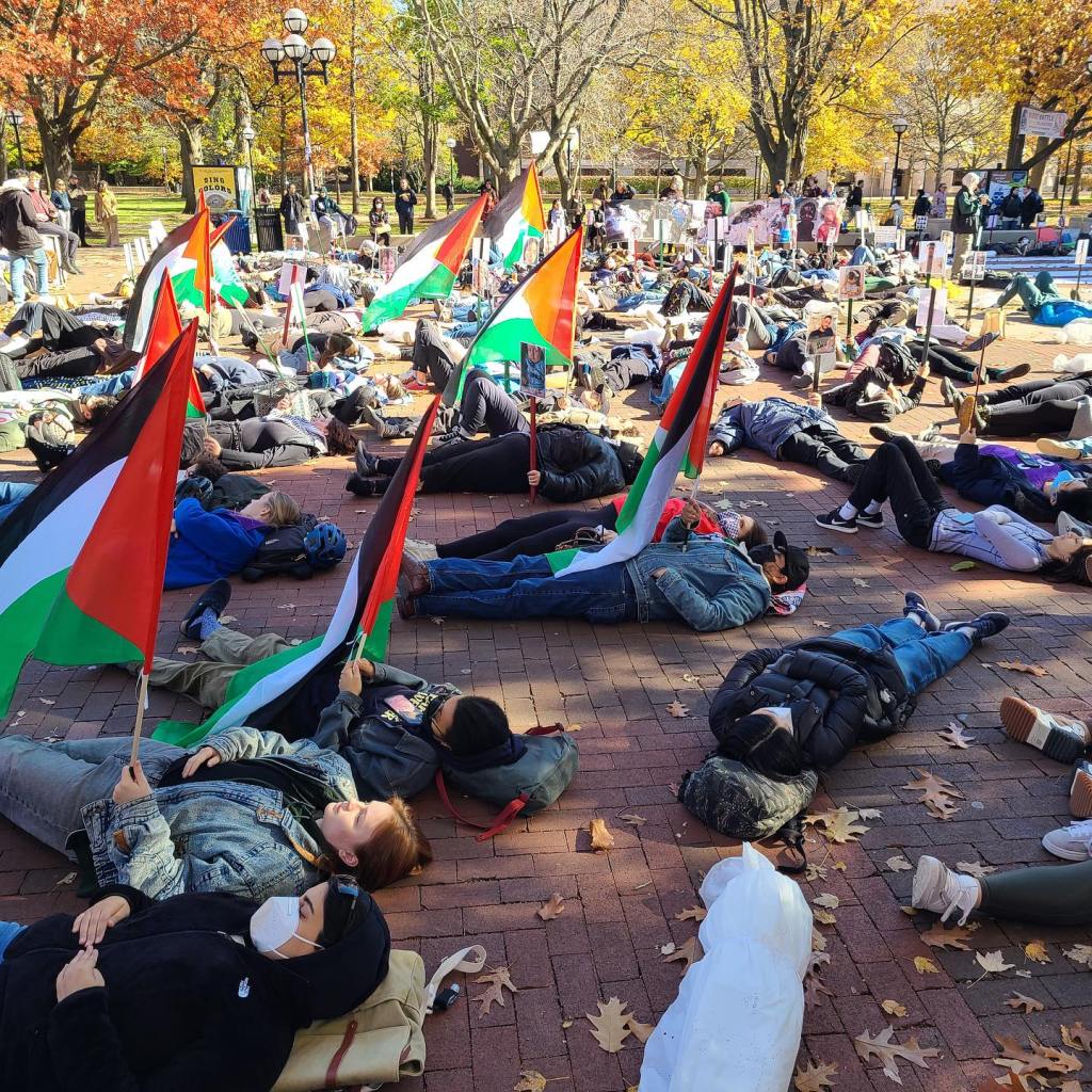 Students laid on the ground on the Diag holding Palestinian flags and posters of the faces of murdered Palestinians, alongside ten large scrolls listing the names of the martyrs. SAFE members read aloud the names of martyrs on a loud speaker throughout the afternoon.