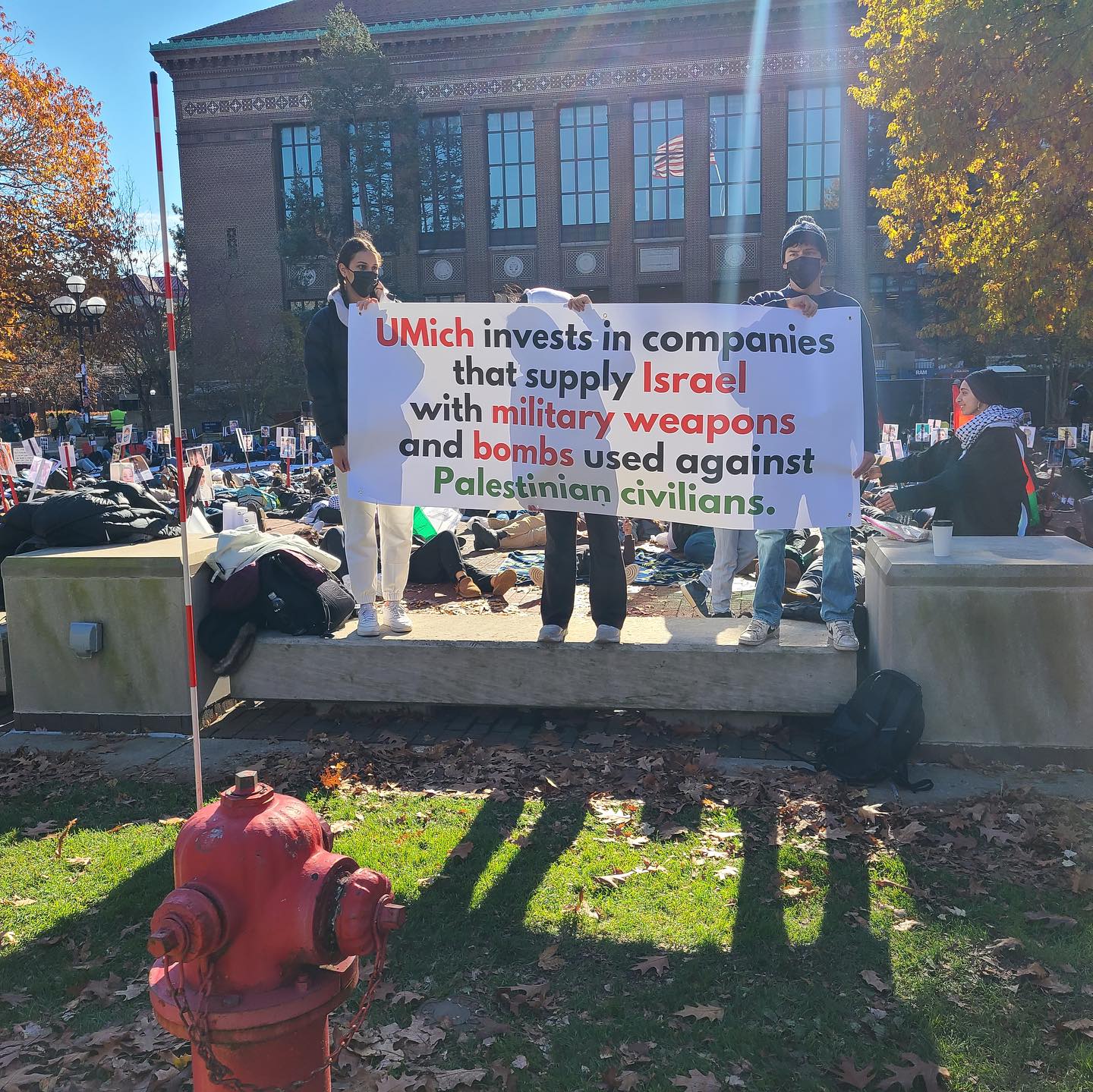 Students laid on the ground on the Diag holding Palestinian flags and posters of the faces of murdered Palestinians, alongside ten large scrolls listing the names of the martyrs. SAFE members read aloud the names of martyrs on a loud speaker throughout the afternoon.